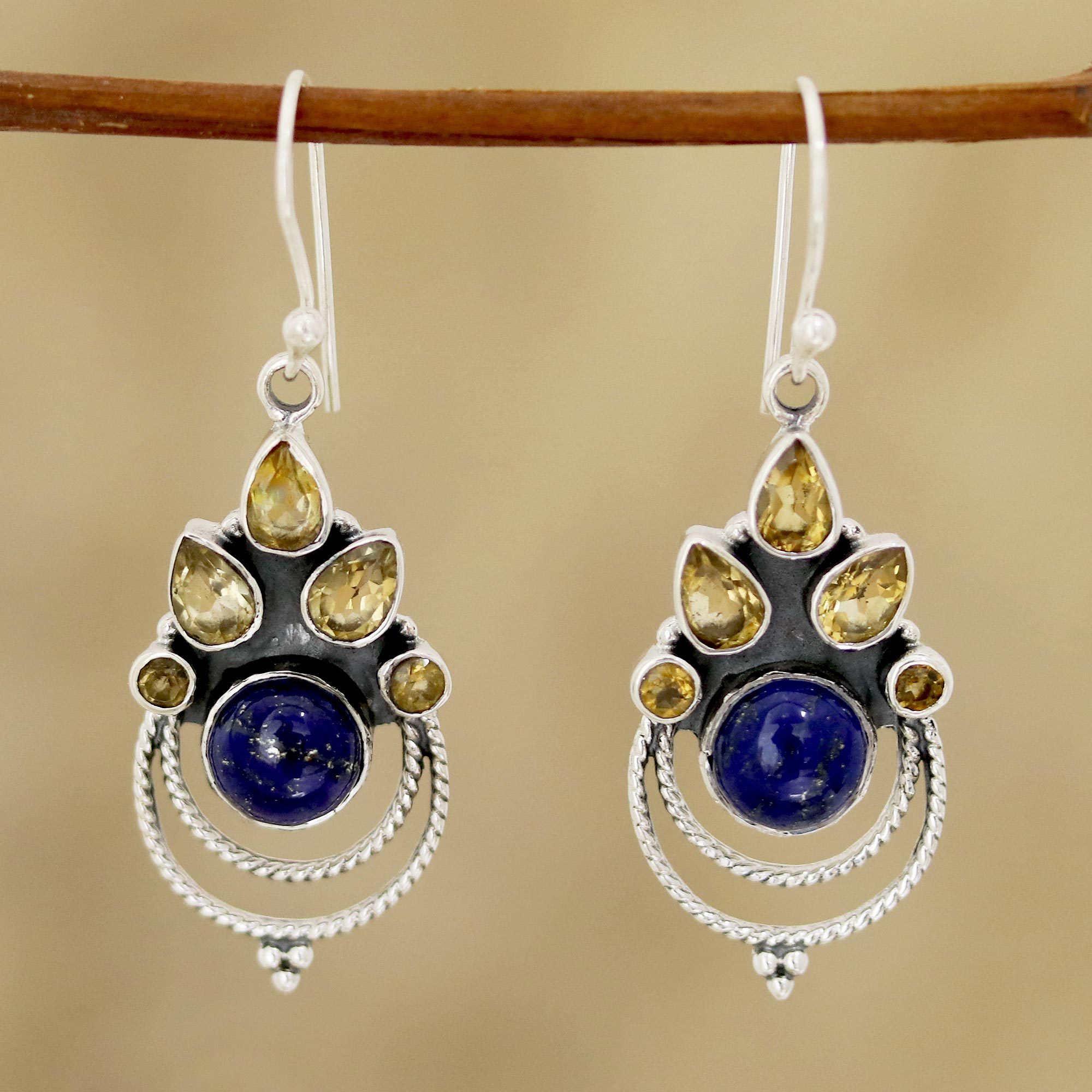Citrine and Lapis Lazuli Dangle Earrings by Indian Artisans, 'Radiant Harmony'