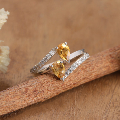 Luxurious citrine gemstones catch every flicker of light in this sterling silver cocktail ring that brings instant glamour to your fingertips. The sophisticated arrangement of the colorful stones complemented by pavé cubic zirconia creates visual depth and movement in this timeless design presented by India's Chintan.