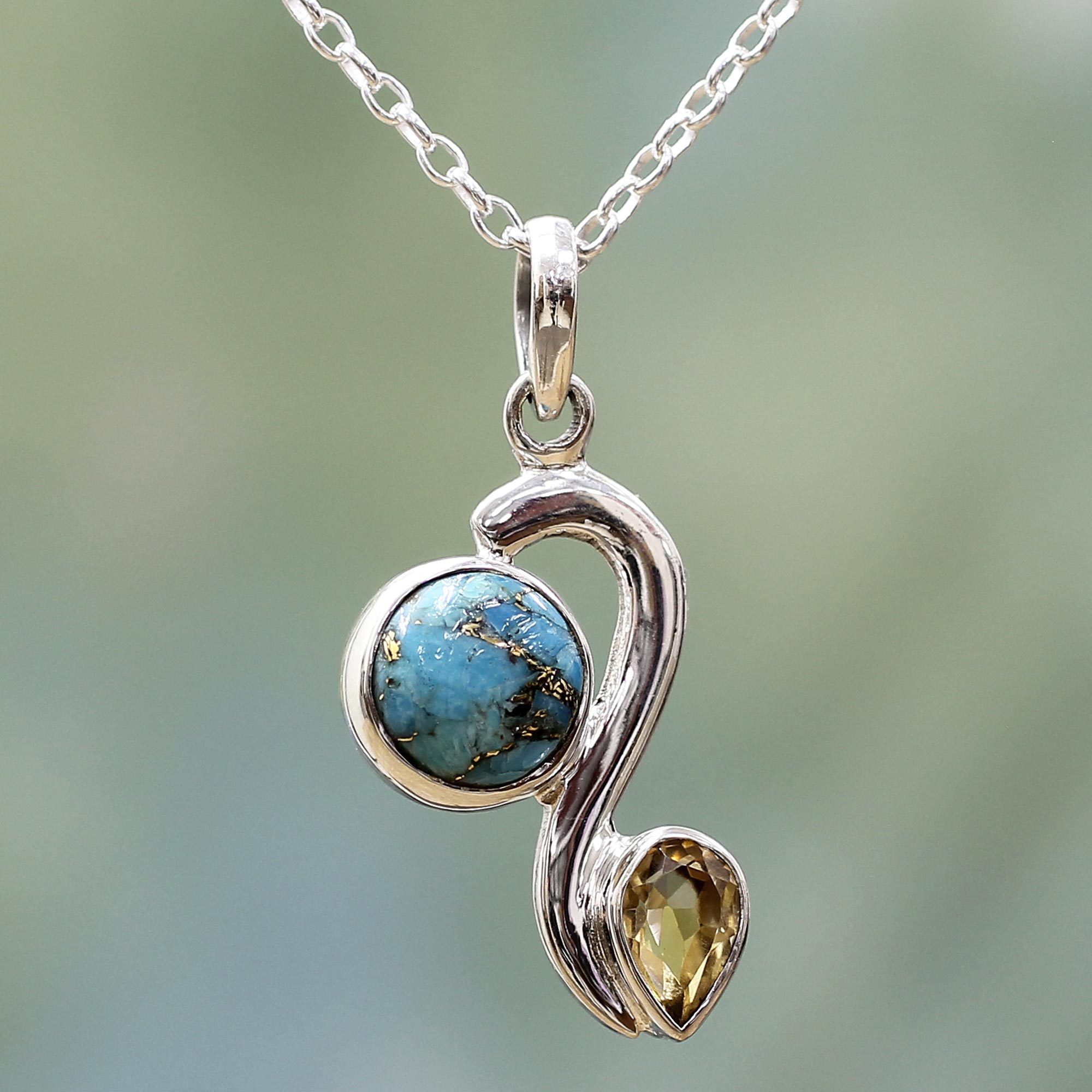 A round stone of composite turquoise sparkles with golden veins across its blue surface, like a brilliant planet. It is accompanied by a teardrop-shaped stone of citrine weighing over one carat in the pendant of this elegant necklace. Presented by Shanker, this Indian necklace features handcrafted wave motifs in sterling silver created by local artisans.