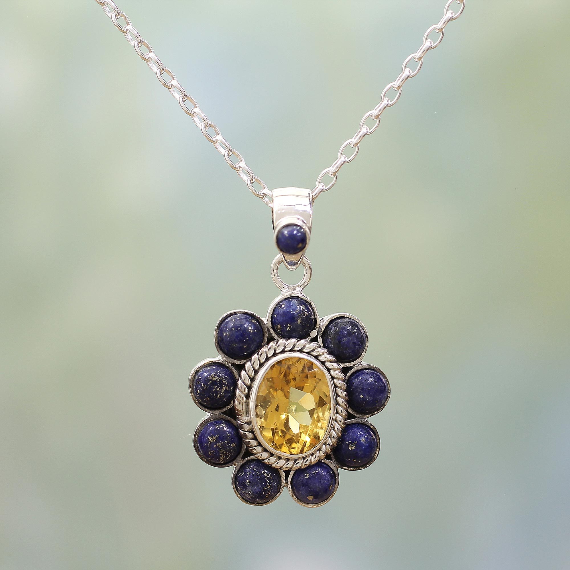 Citrine Lapiz Lazuli Sterling Silver Necklace NOVICA India, 'Sunny Blue'