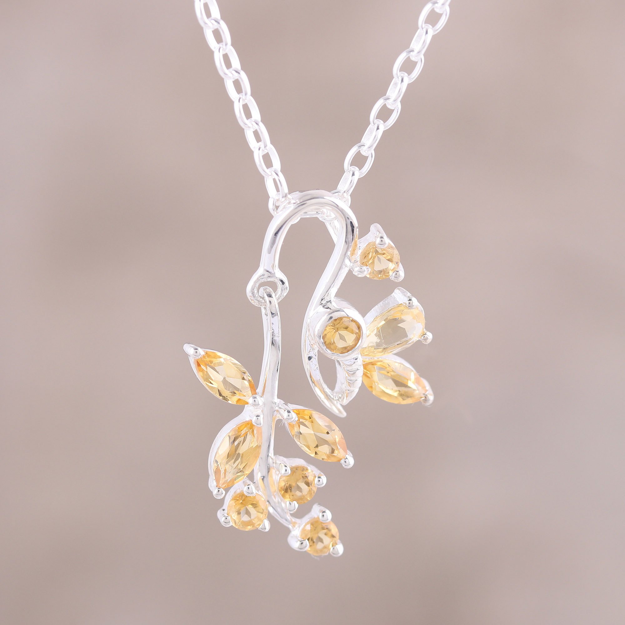 Alok Jain of India presents a beautiful pendant necklace in sterling silver and citrine gemstones. The pendant features a graceful curve of sterling silver wire with faceted citrine forming leaves and flowers. A butterfly of citrine gemstones rests daintily on one side of the pendant.