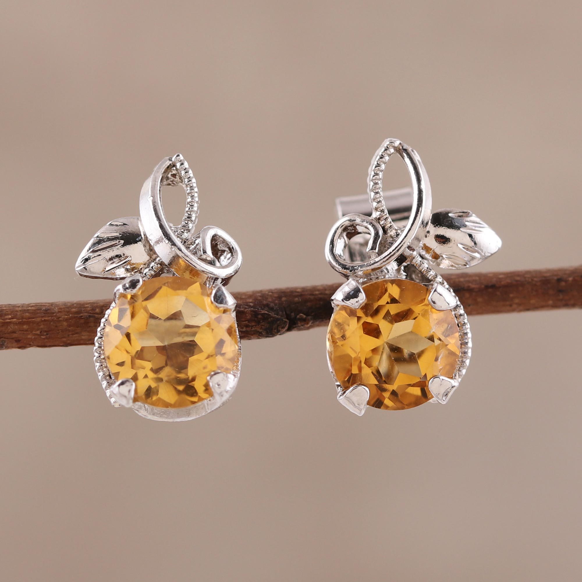 Handcrafted from sterling silver bathed in rhodium, leafy vines frame two gemstones of faceted citrine, weighing 1.5 carats together. Alok Jain presents these stud earrings from India.