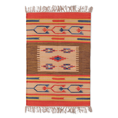 Warm hues and exquisite artistry surround the details in Mahmood's dhurrie rug, filling your spaces with echoes of India's textile tradition. Talented artisans use refined cotton yarns in a handloom, weaving brown, beige, red, and blue in a captivating pattern finished with fringes.