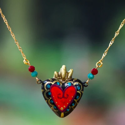 The whispers of a secret romance live inside Edith Orozco's newest creation. Made with love and desire for a world full of passion, this 14k gold-plated copper necklace embellishes its glorious chain with crystals in red and green hues. A papier mache heart serves as a pendant, showcasing the elegant side of a mysterious liaison—all hand-painted by the artisan in Mexico.