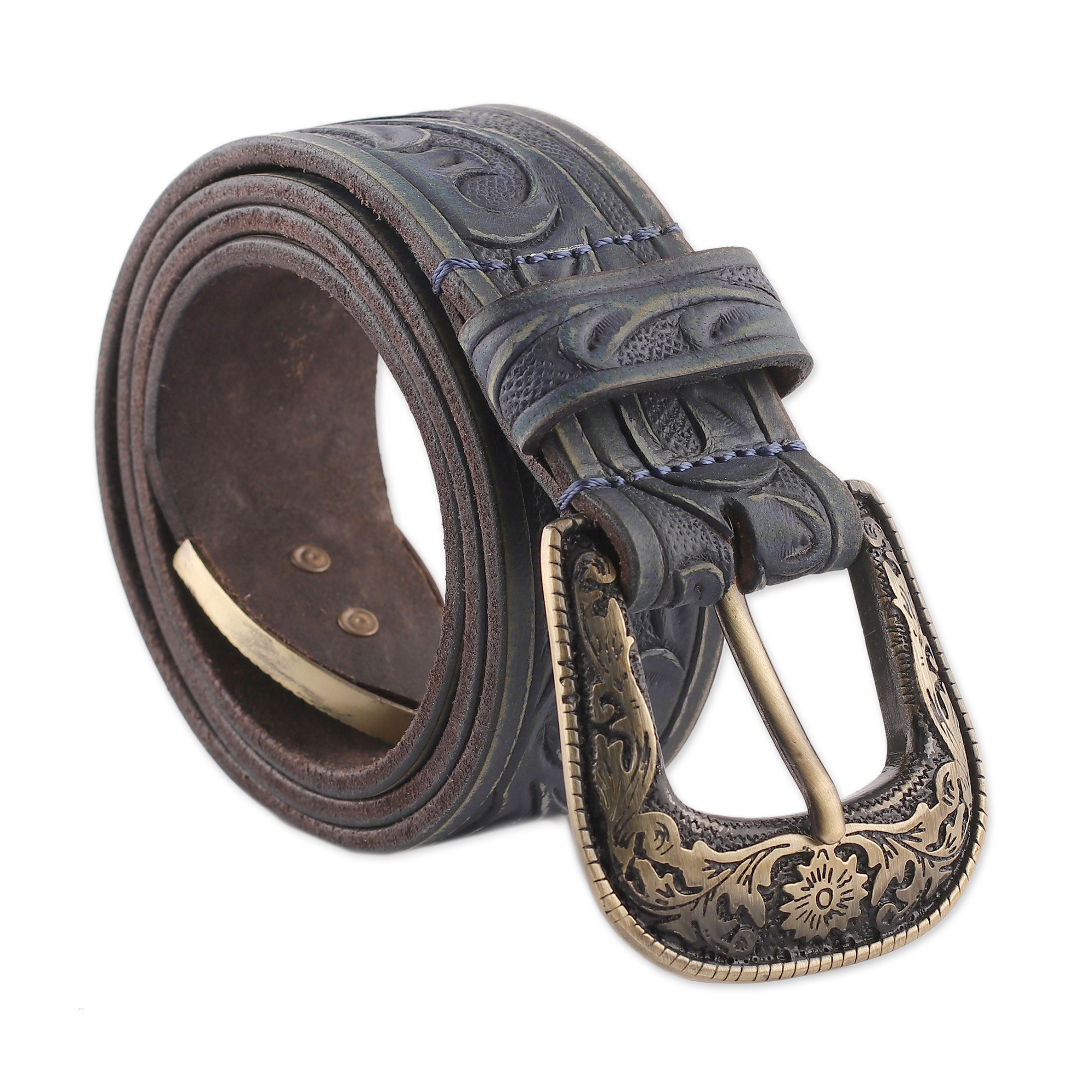 Classic-Patterned Handmade Navy Blue Leather Belt for Men, 'Navy Gallant'