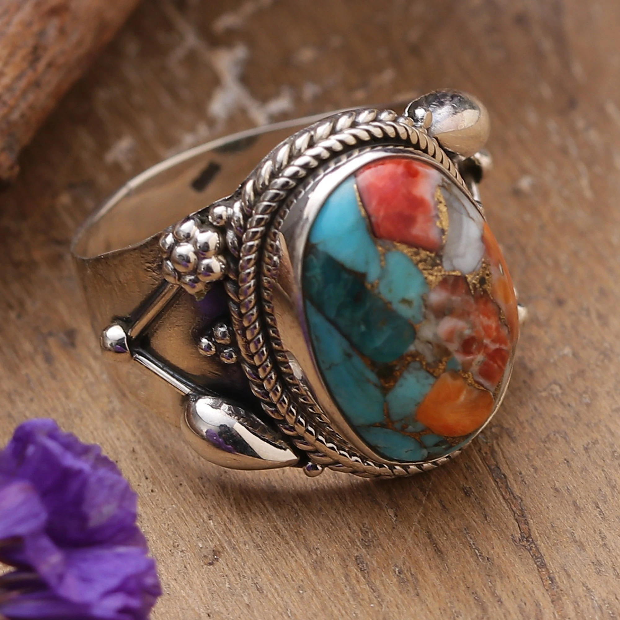 The elegance of the Indian region embellished this sublime piece by Rakesh Rana. The artisan puts his experience into practice to create this stunning cocktail ring, whose sterling silver structure displays glamour while elegantly embracing a reconstituted turquoise jewel of charming hues.