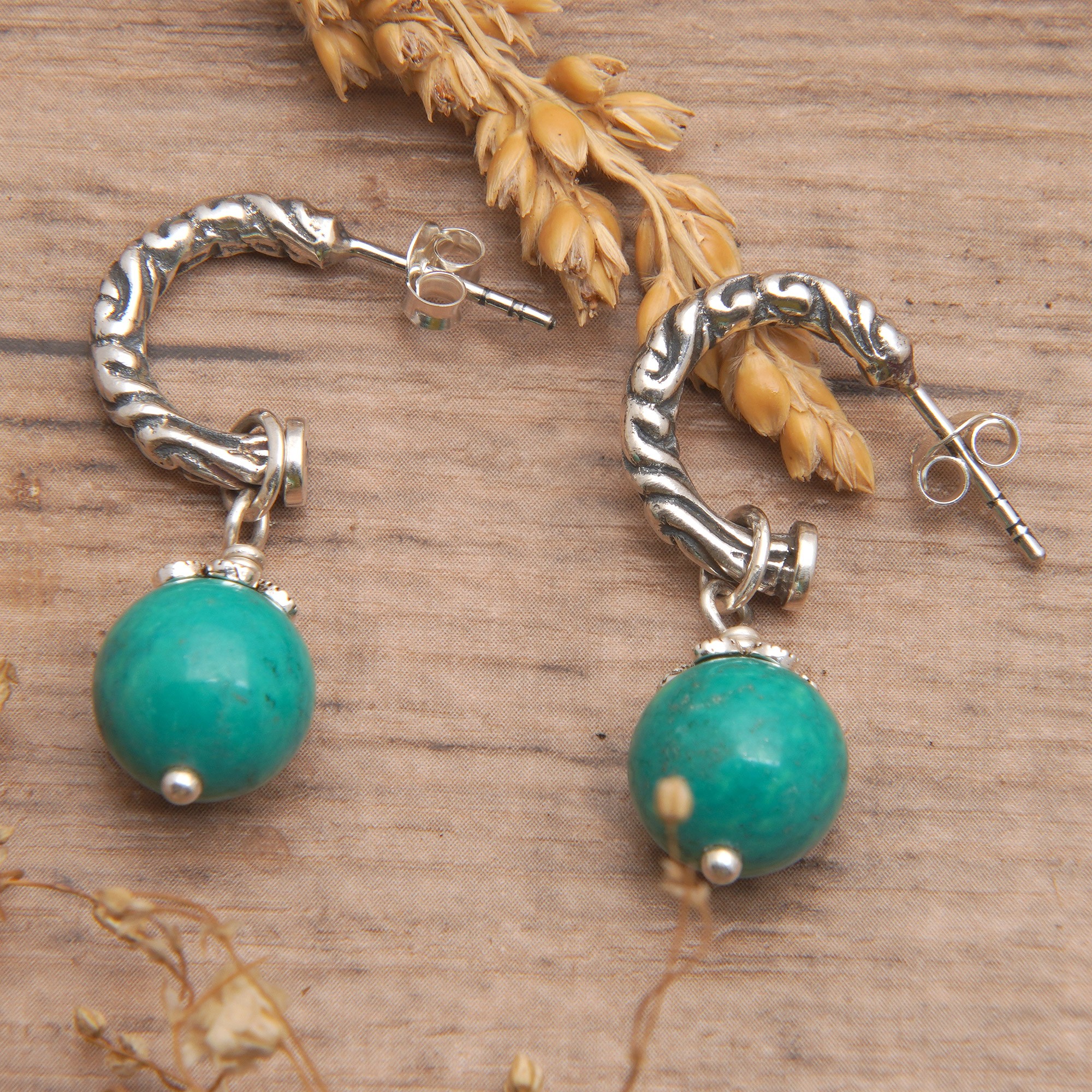 Traditional accents embellish this precious creation made in honor of Mother Nature. Balinese artisan Ni Wayan Astiti combines the beauty of the region's classic details with a stunning green light to create these half-hoop dangle earrings, whose reconstituted turquoise stones send a message of peace and harmony to the world.
