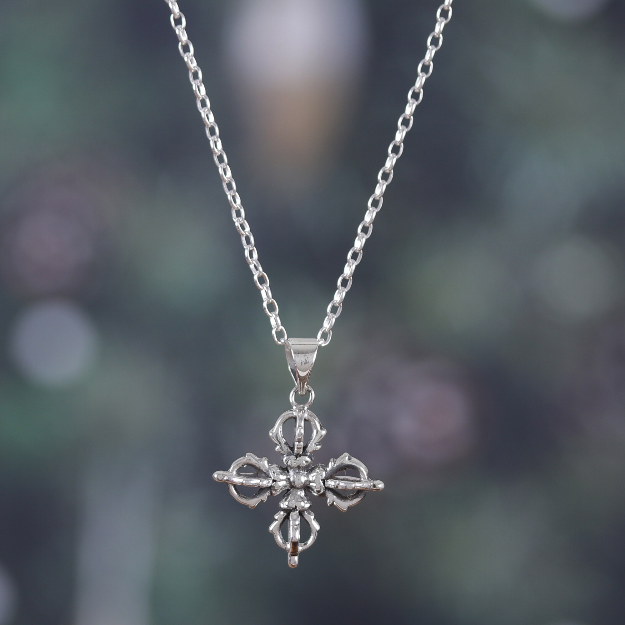Classic Sterling Silver Dorje Pendant Necklace from India, 'Dorje Flower'