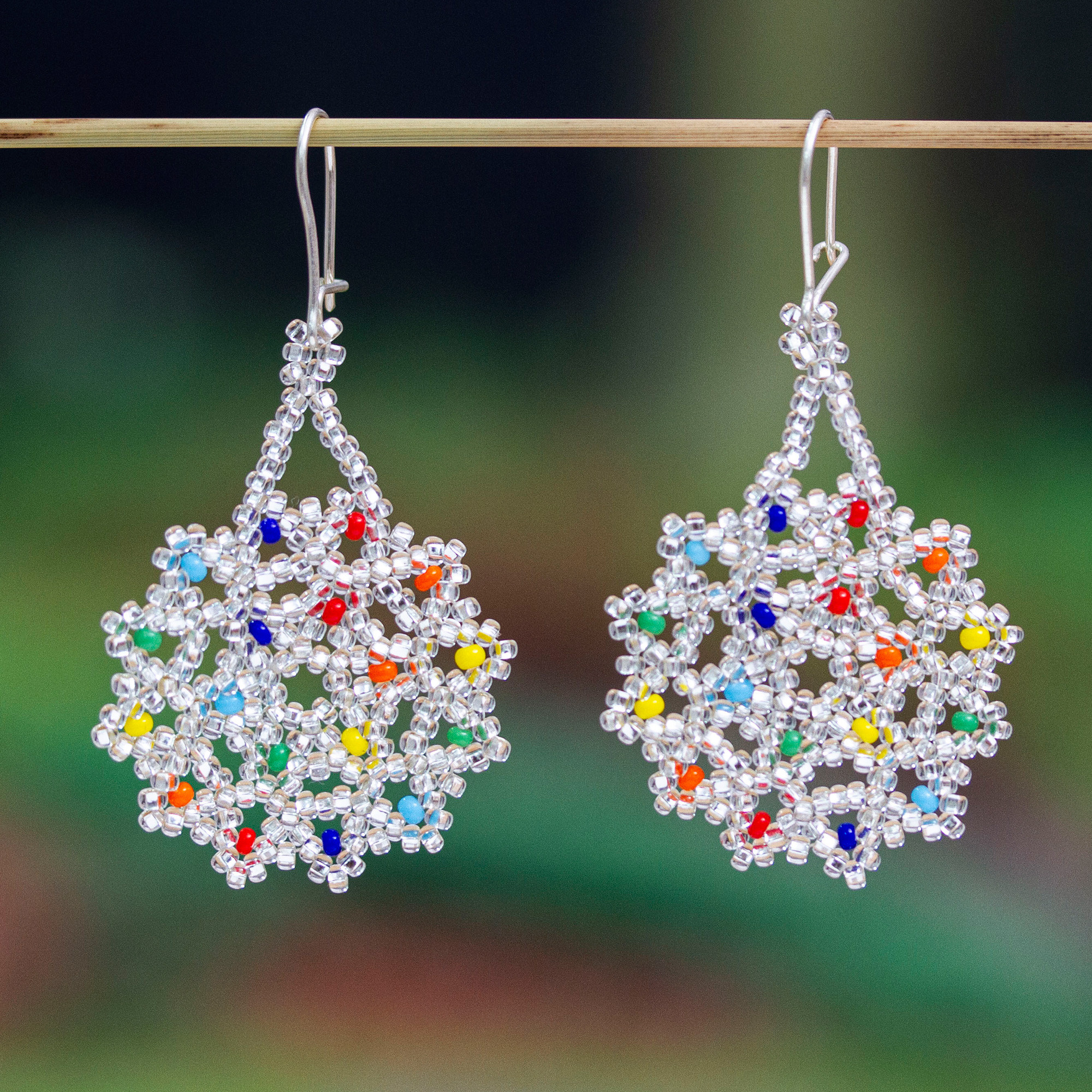 Ethereal in their beauty, dazzling floral medallions are crafted by hand from clear and multicolored glass beads. Mexican artisan Adriana Trejo creates these delightful dangle earrings, which dance sterling silver hooks.