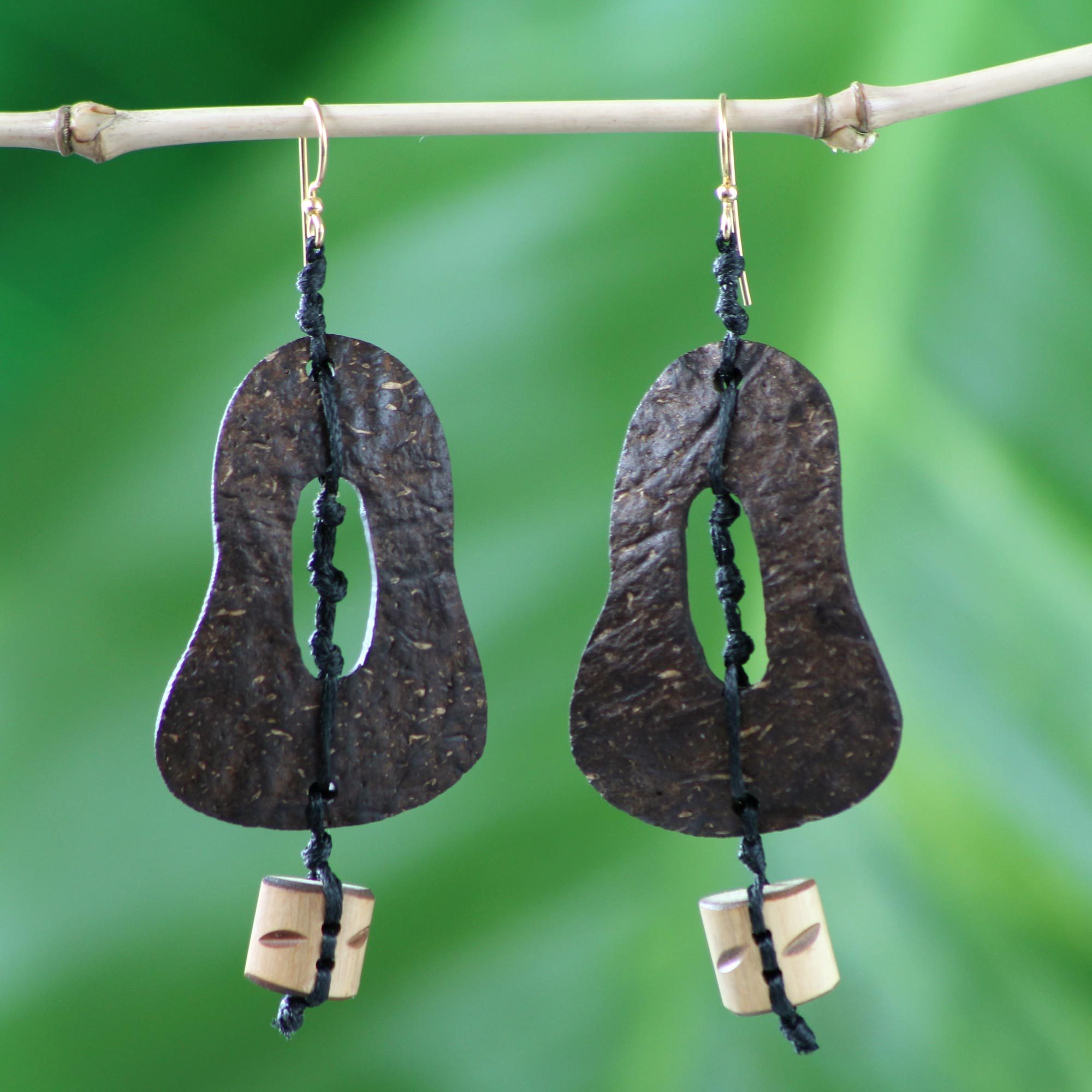 Eco-friendly coconut shell is transformed into a unique piece of jewelry art. By Nonyem Abena Ibeneme from West Africa, these earrings are handcrafted from natural materials, including coconut shell and bamboo. Completed with brass hooks, they are a warm and earthy pair which recall the natural beauty of the forest.