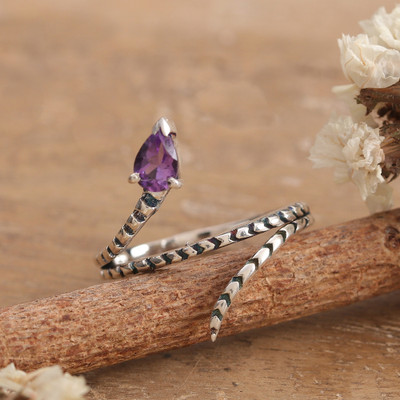 Coiled Snake-Shaped Silver Cocktail Ring with Amethyst Stone, 'Coiled Snake'