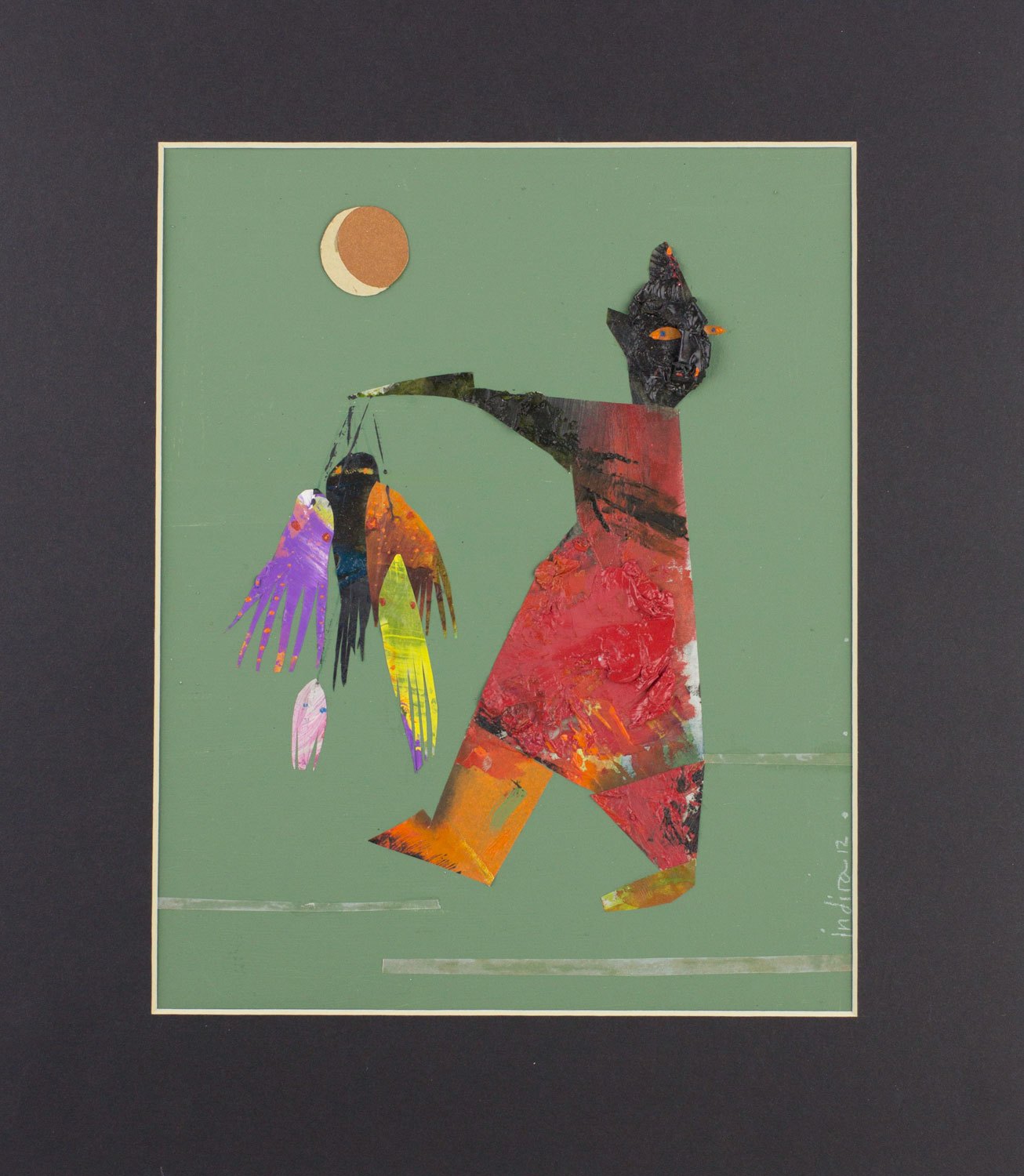 A fisherman presents a dangling bouquet of colorful octopi, the object of his fishing expedition. Creating texture with applications of illustration paper and adding color with oil pigments, Indira Castellon creates a unique collage. "I explore the relationship between predator and prey," she explains. The painting arrives in a mat board passe-partout.