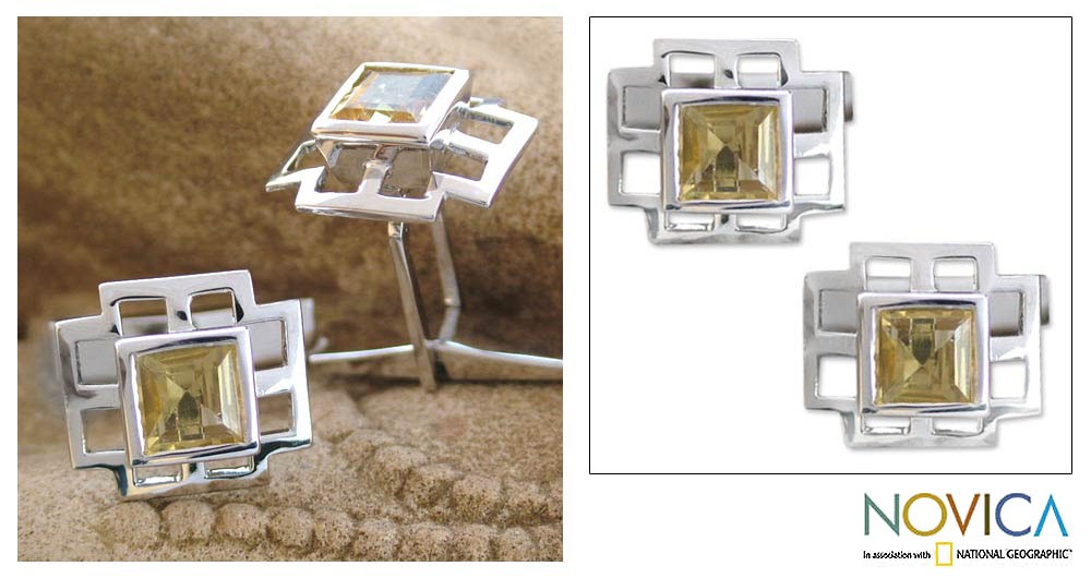 Shubhra Singh erects a tower in the mind, crowning it with a square cut citrine. Sparkling with the sun's radiance, the gems center sterling silver cufflinks.