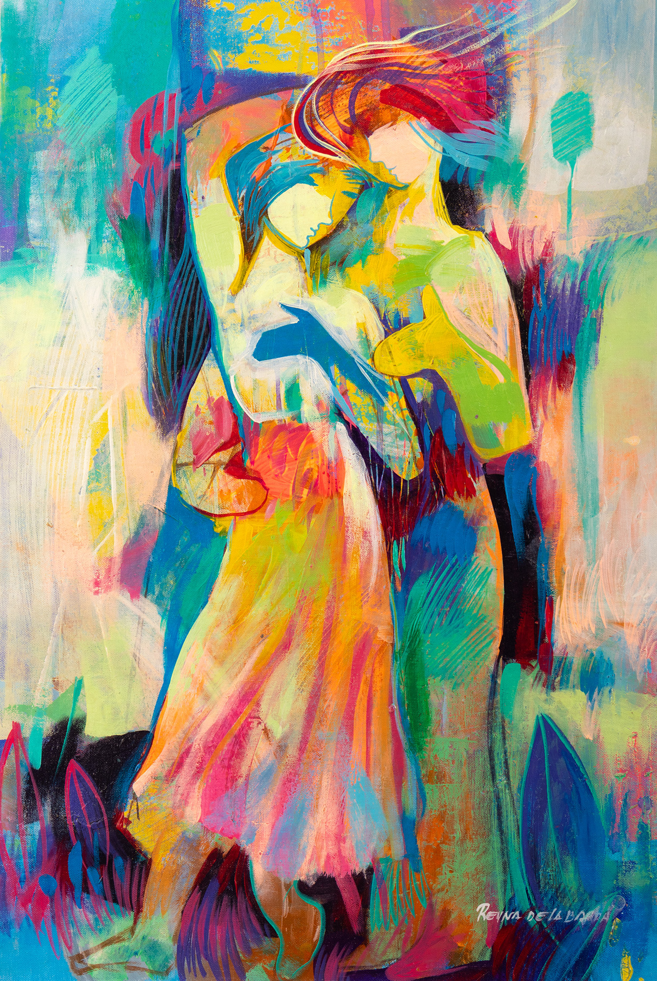 Peruvian artist Reyna de la Barra creates an ode to love in this mesmerizing abstract oil painting where harmonious strokes intertwine on the canvas in a dance of warm and vibrant colors. Soft pinks, reds and violets blend into smooth transitions, creating a sense of warmth and passion. At the center of the composition, abstract male and female forms intertwine organically, symbolizing the union of two souls in love dancing to the rhythm of music. Their contours subtly blur, suggesting their connection goes beyond the physical form and delves into the emotional and spiritual realms.