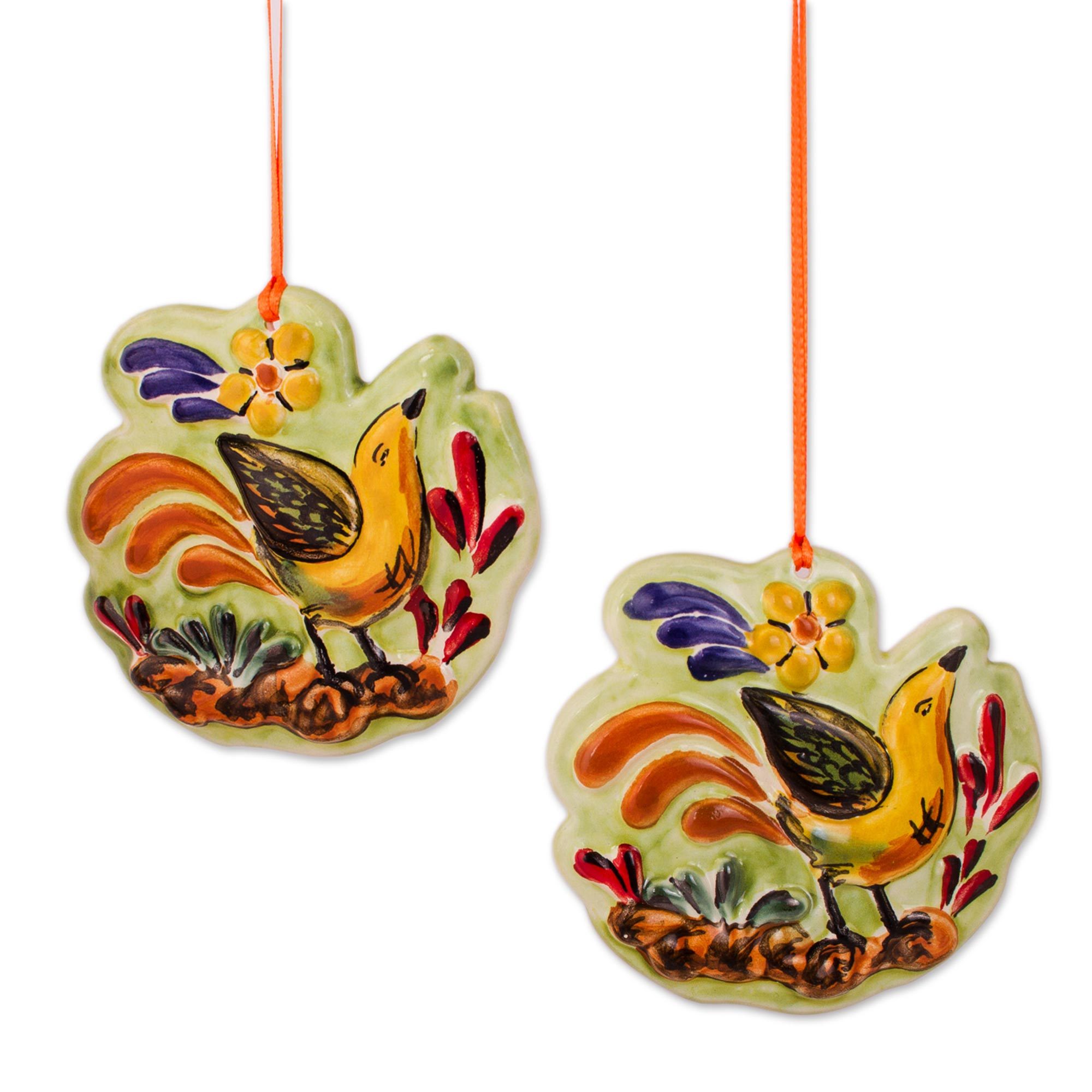 Offering its song to the world, a yellow bird is depicted against a verdant landscape. Created by Mexican artisan Gorky Gonzalez, this pair of ornaments is crafted from ceramic and painted by hand in the traditional style of majolica handicrafts. Each ornament is marked with the artisan's signature, as well as the letters "AT" for Alfarería Tradicional (Traditional Pottery).
