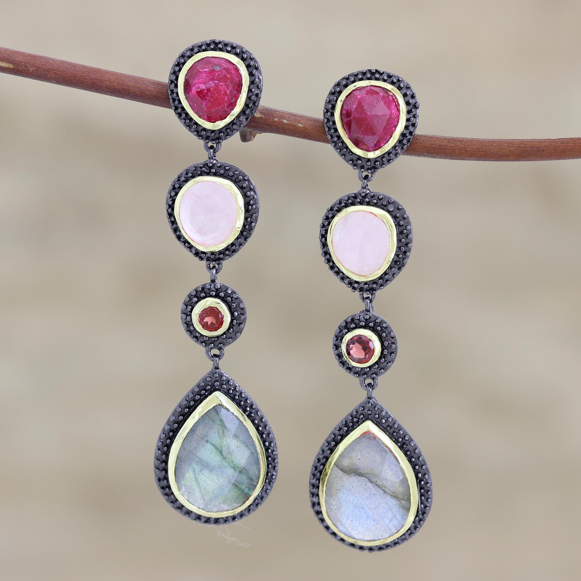 These magnificent dangle earrings are from India's Neetu Barathi, who has a knack for combining gemstones in interesting ways. The sterling silver post earrings feature faceted ruby, rose quartz, garnet and labradorite in darkly oxidized settings that are artfully accented with polished 18k gold. The colorful gemstones weigh approximately 26 carats in total.