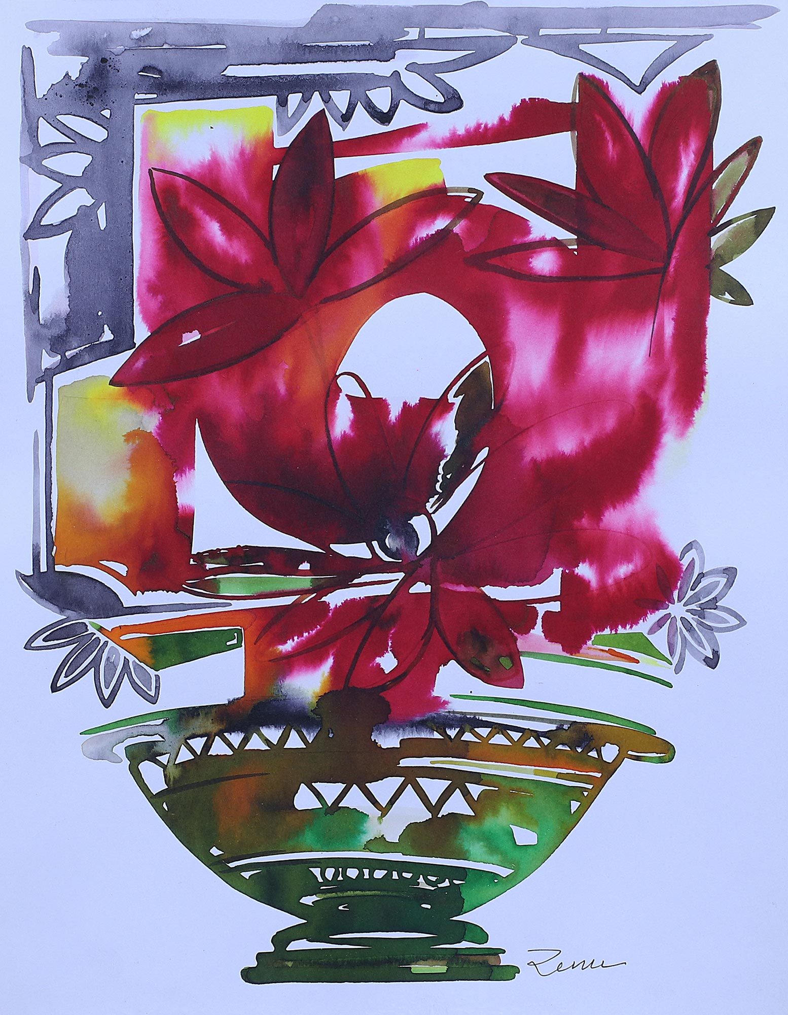 Vivid reds and bougainvillea shades bring passion to this beautiful still life. Posing in a vase, flowers share their sweet fragrance in an original painting by Renu Jaiswal.