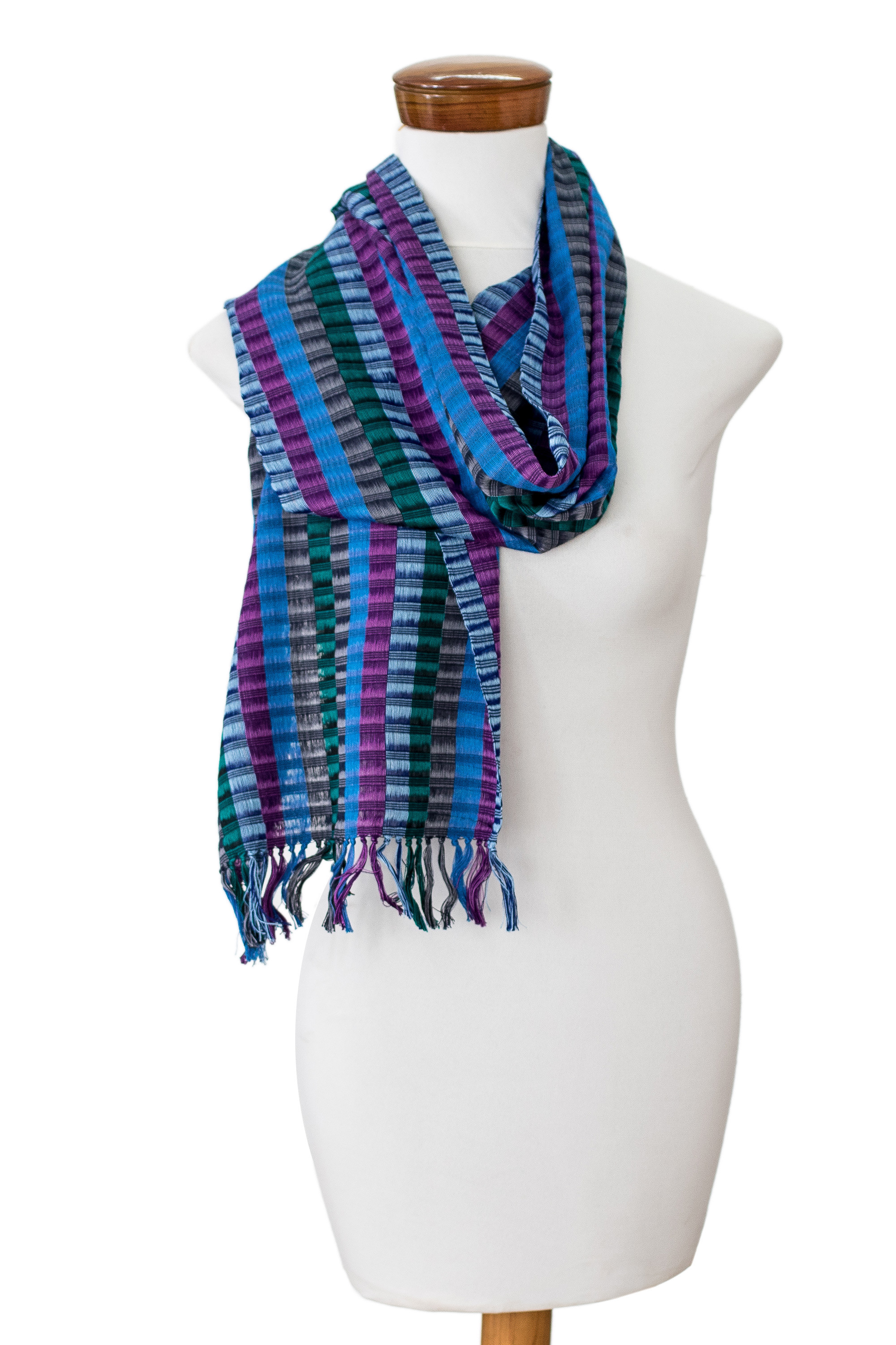 This sublime scarf boasts colorful stripes, delicate fringes and a fascinating combination of blue, light blue, grey, purple and teal hues. Skillfully hand-loomed by artisans from the San Antonio Palopo Cooperative in Guatemala, this cotton accessory is a must-have for those seeking to inject vibrancy into their style.
