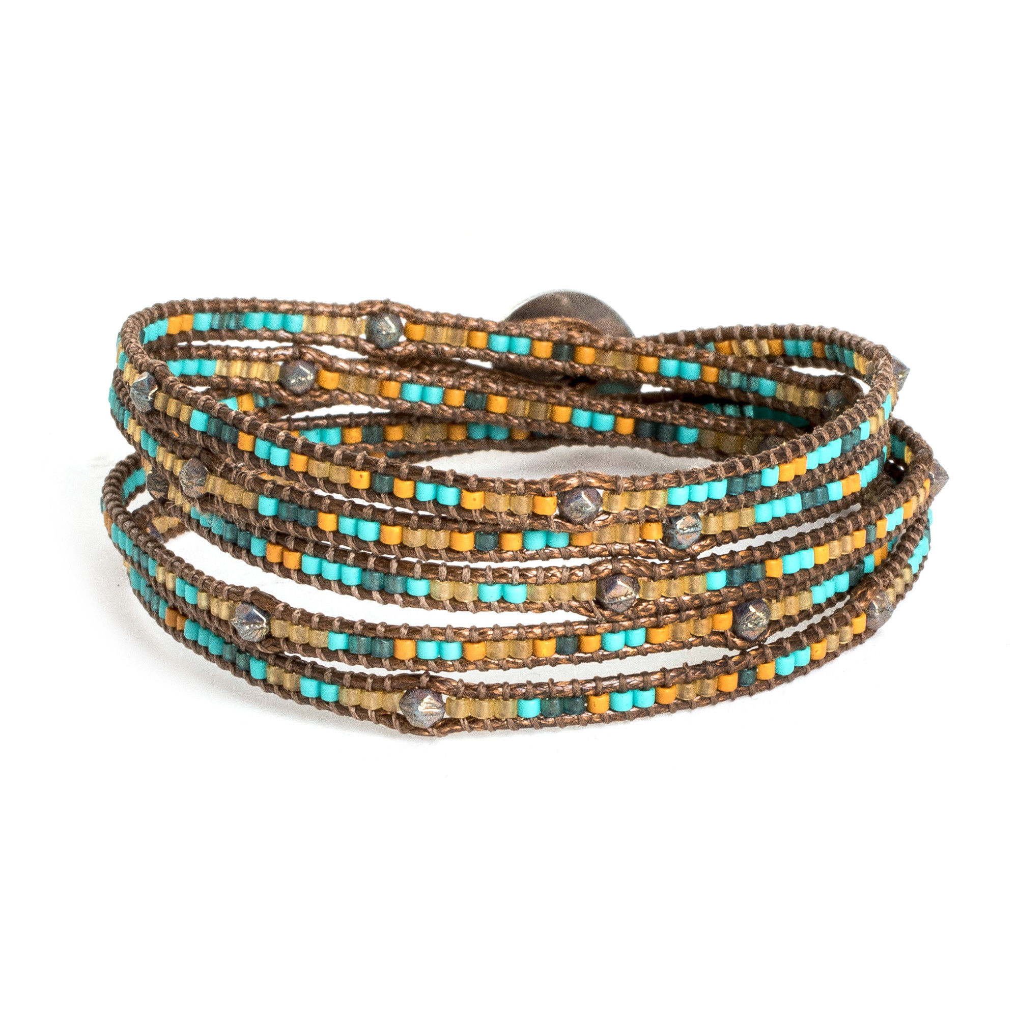 This vibrant wrap bracelet winds around the wrist in layers of rich onyx and lustrous glass beads, each carefully chosen for its unique shade and depth. Guatemalan artisan Cristobal Ramirez's multi-colored design creates a kaleidoscope effect that shifts and changes with movement while the smooth pewter button closure adds both security and sophisticated contrast to the colorful array.