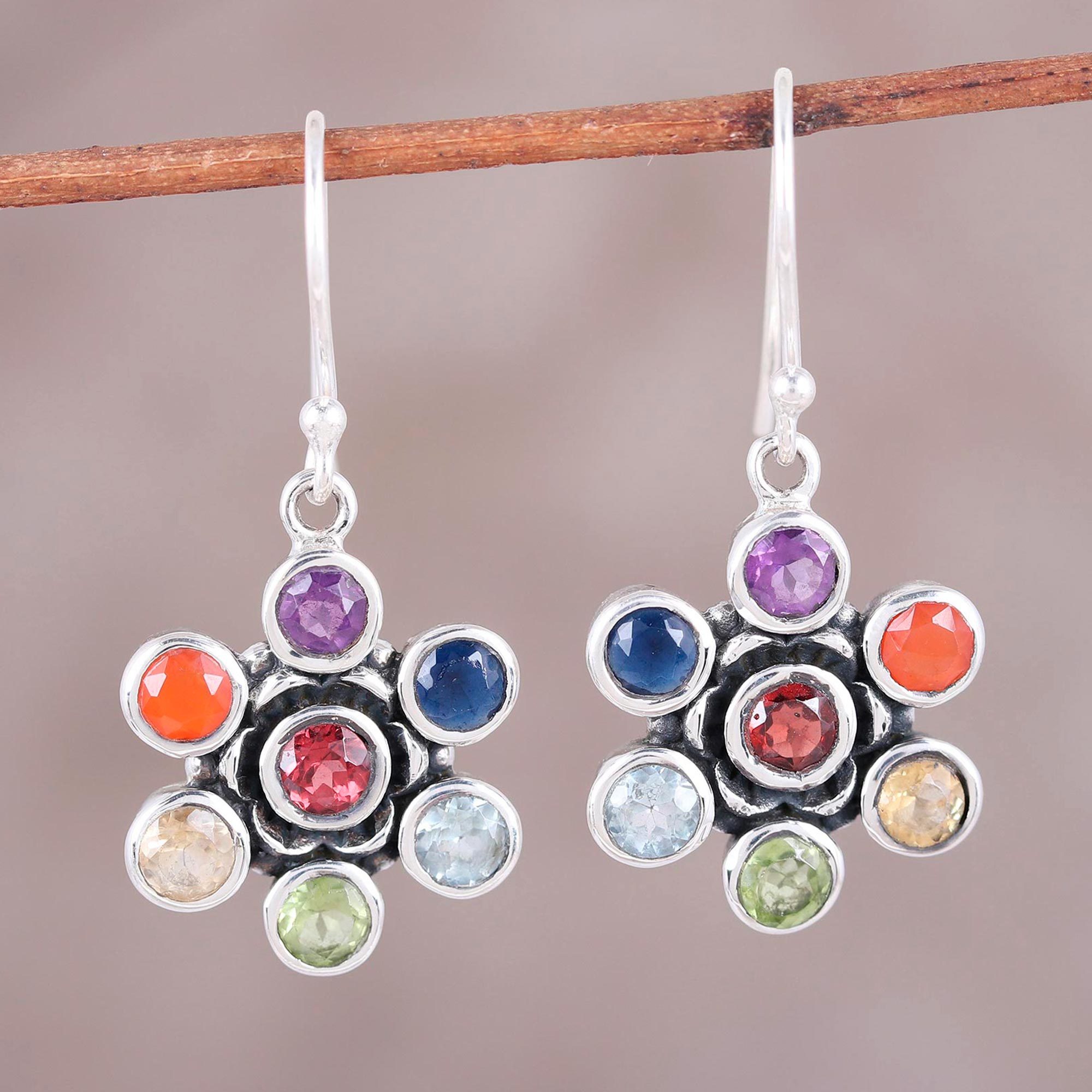 In Sanskrit, chakra refers to an energy vortex through which vital universal forces are channeled. It is believed that each individual possesses seven of these powerful areas. When balance is achieved with each, the body, mind, and spirit all work as one, bringing about a greater sense of health and well-being. Designed to bring about harmony within each chakra, this pair of vibrant dangle earrings is presented by Chintan of India. Crafted with high-polished sterling silver, the earrings feature beautiful, faceted stones of blue topaz, carnelian, garnet, citrine, peridot, amethyst, and sapphire. Placing the garnet stone at the center, the artisan arranges the colorful gems into the shape of a flower, creating a stylish, charming design.