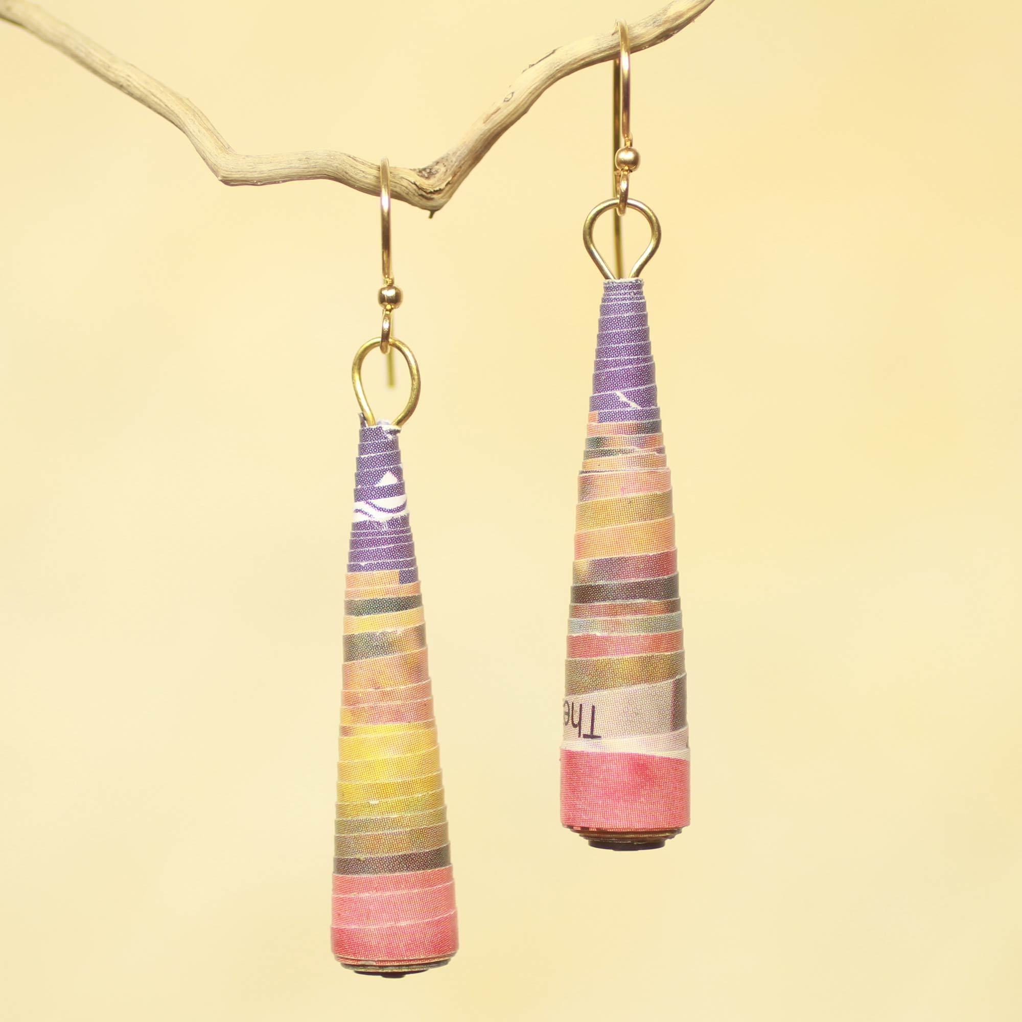 By Akwele Suma, these colorful earrings evoke summer flowers. She combines long, slender beads made from recycled paper with diminutive disks cut from plastic bottles.