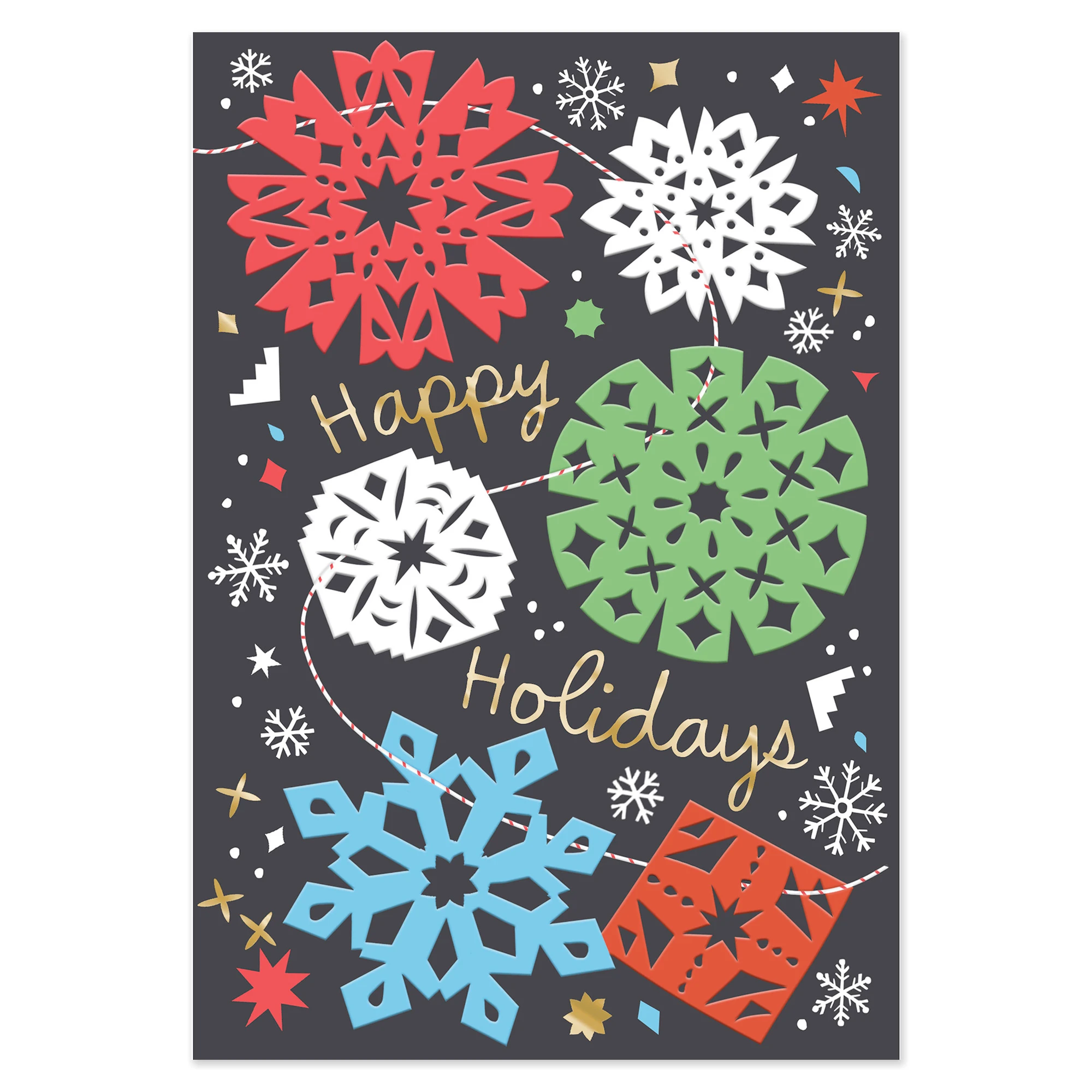 Celebrate the season with a vibrant flurry of paper-cut snowflakes. Inspired by the charm of hand-cut holiday crafts. Inside greeting "Hope this time of year brings sweet surprises and fun memories that live in your heart all year long."