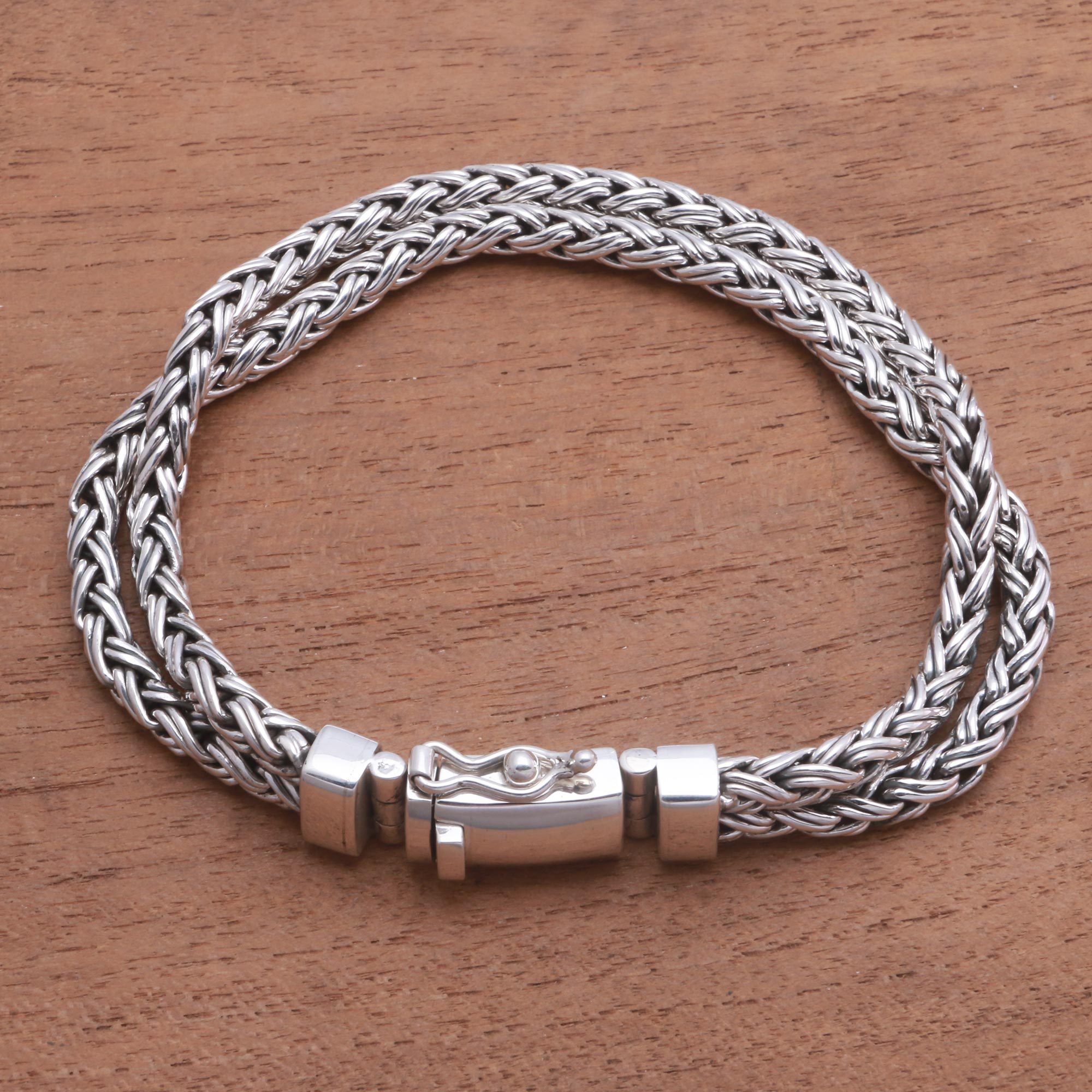 Handcrafted from sterling silver, two lengths of double-linked wheat chain circle the wrist. Wayan Asmana presents this luxurious bracelet for men, crafted by Balinese artisans. This accessory closes with a sterling box clap.