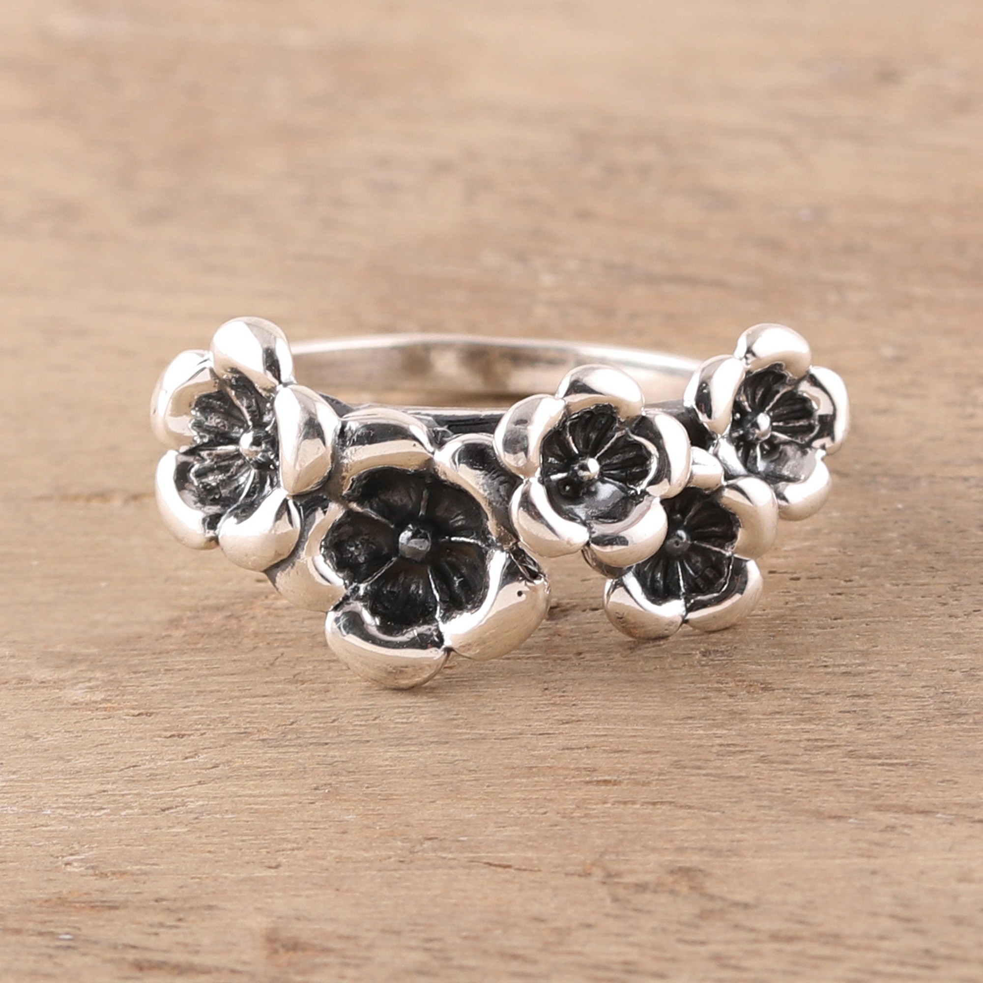 A combination between high-polish and oxidized finish gives a beautiful contrast to five petite flowers handcrafted from sterling silver. Working with Indian artisans, Neetu Barathi designs this lovely cocktail ring.