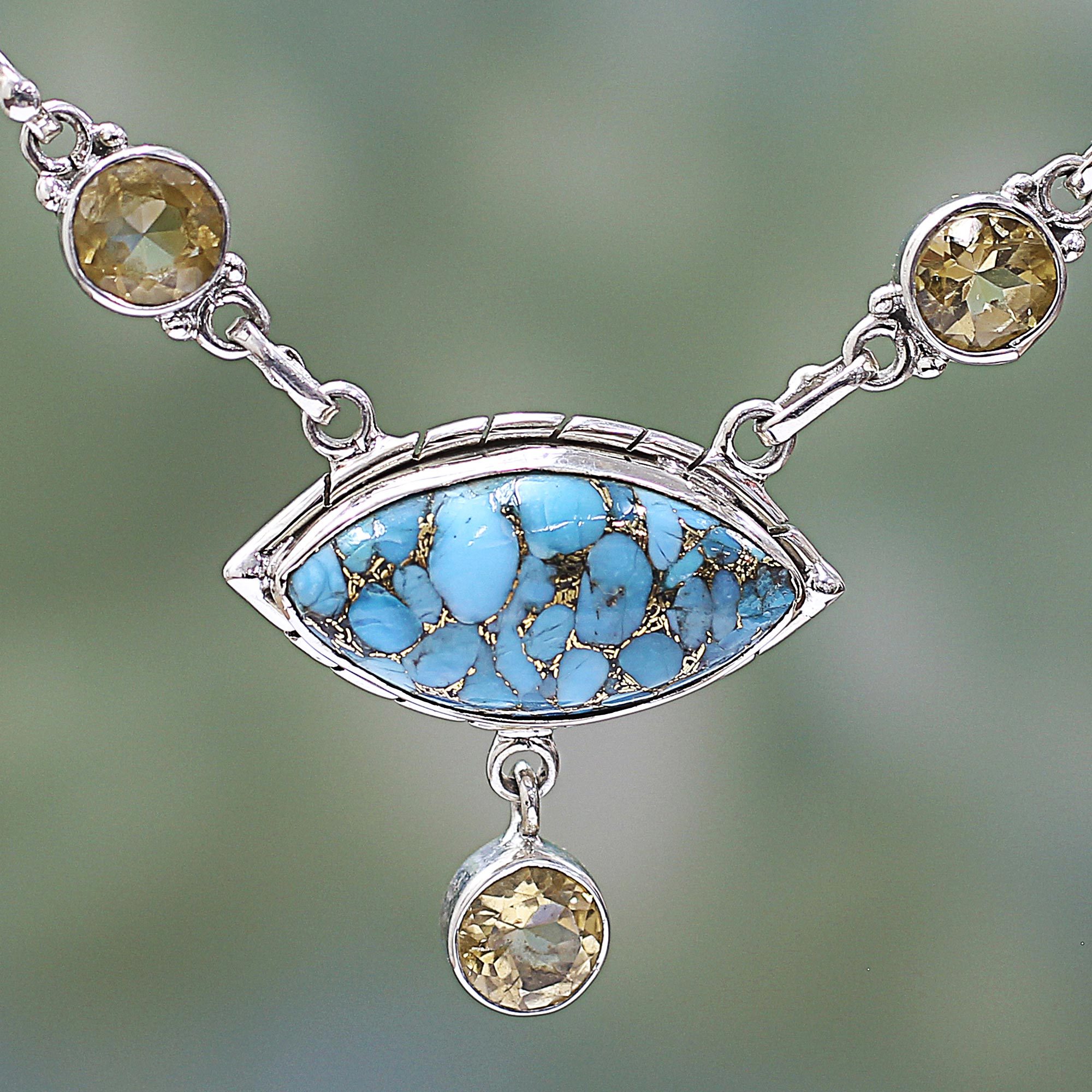 Composite Turquoise and Citrine Pendant Necklace India, 'Protective Eye in Light Blue'