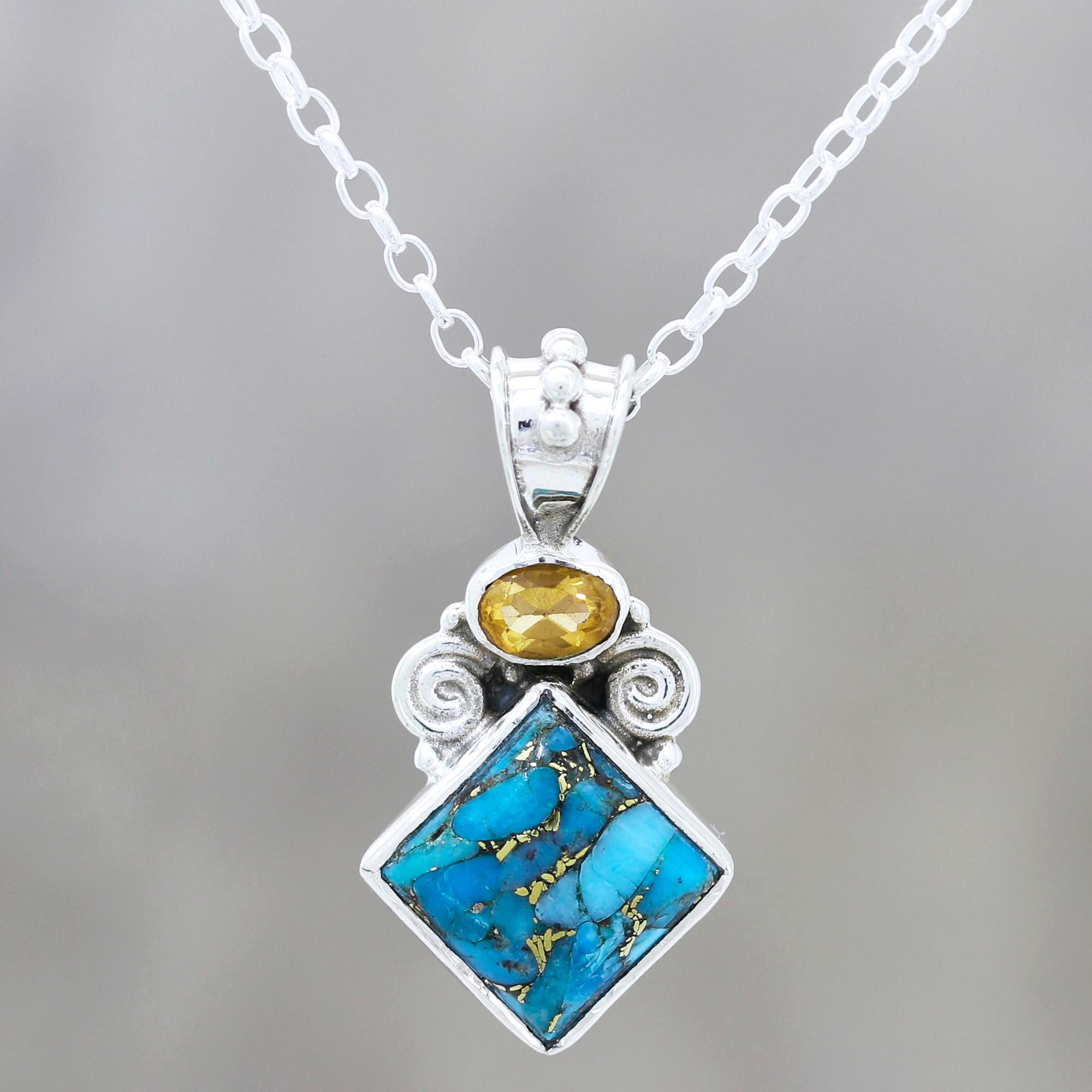 Composite Turquoise and Citrine Pendant Necklace from India, 'Timeless Allure'