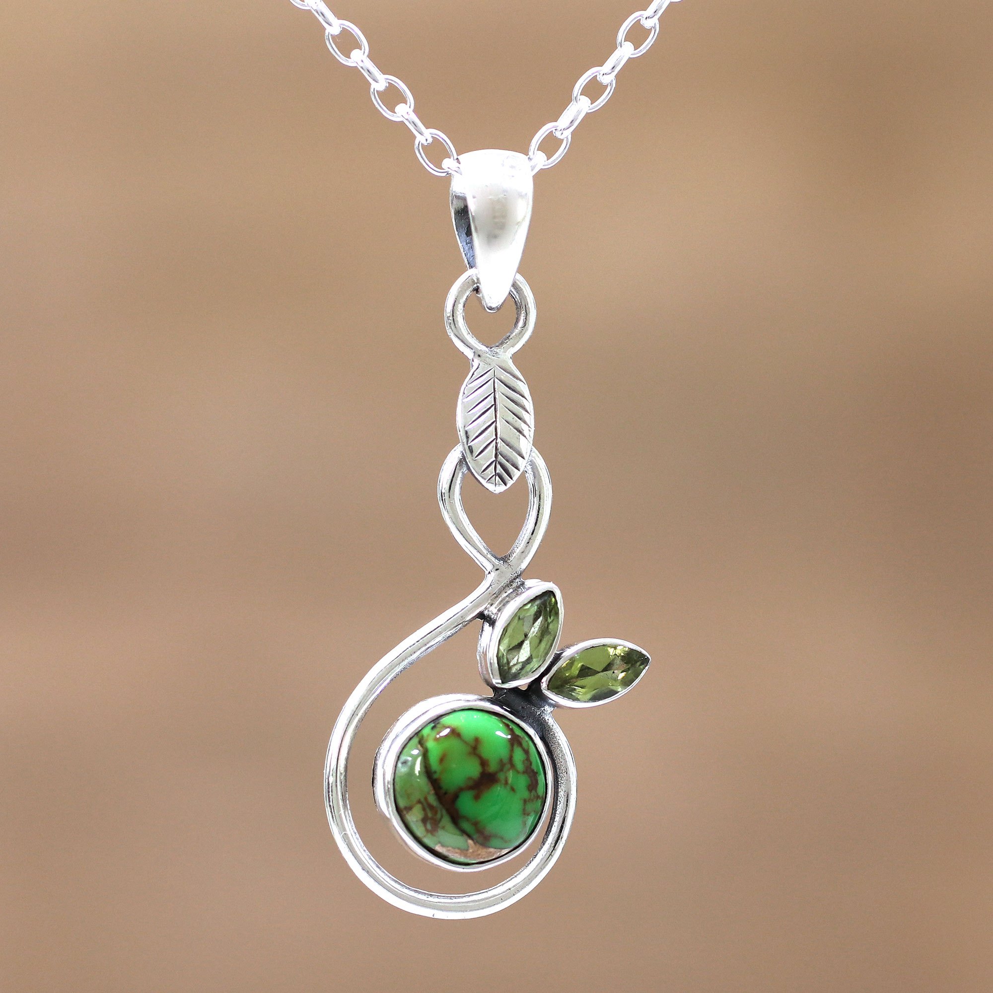 Evoking the beautiful verdure of springtime, this pendant necklace is presented by Shanker of India. Within a sterling silver swirl, leaf-shaped peridots rest atop green composite turquoise.