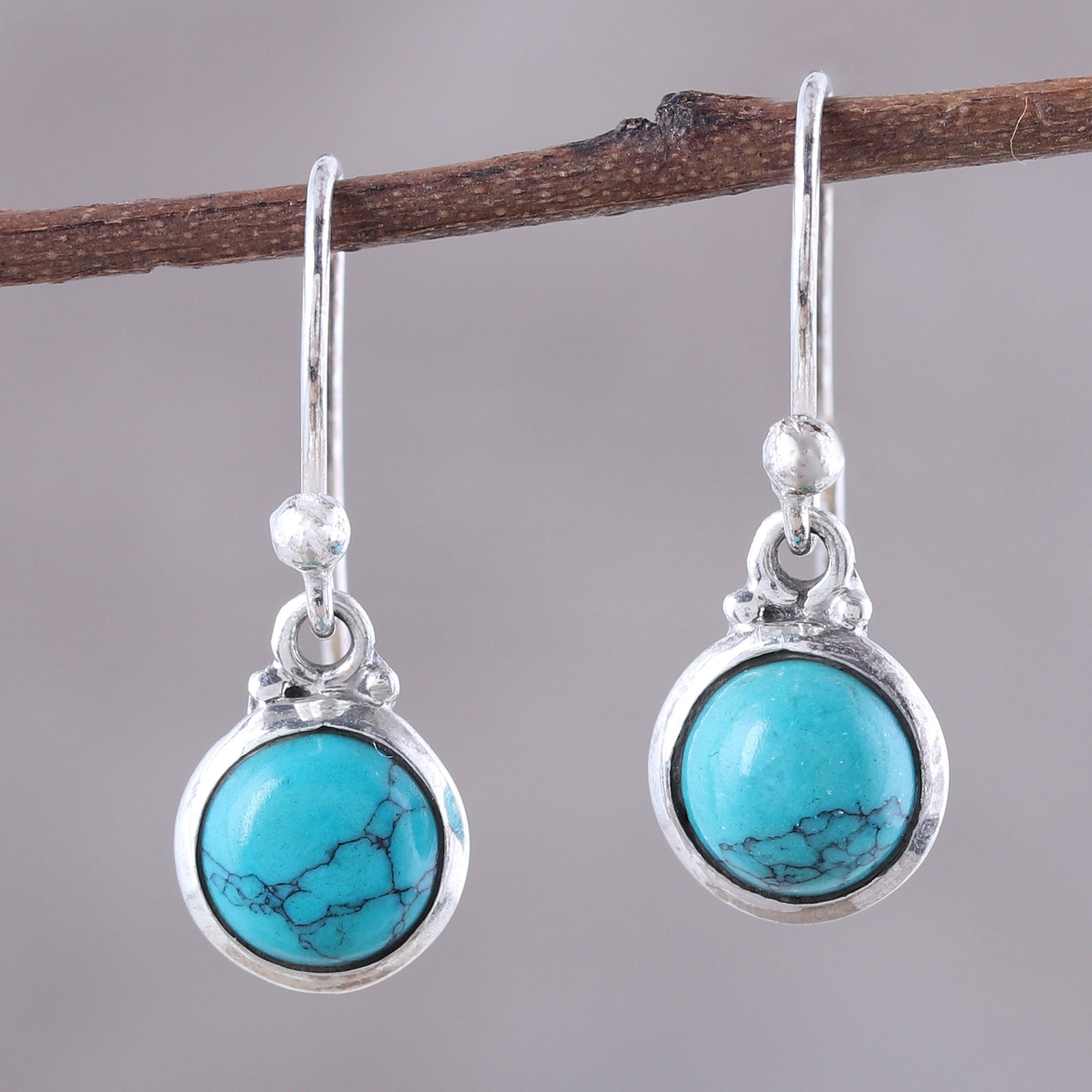 Two cabochons of sky blue composite turquoise gleam happily in this pair of dangle earrings from India. Designed by Bhavya Jain, these earrings are crafted of sterling silver.