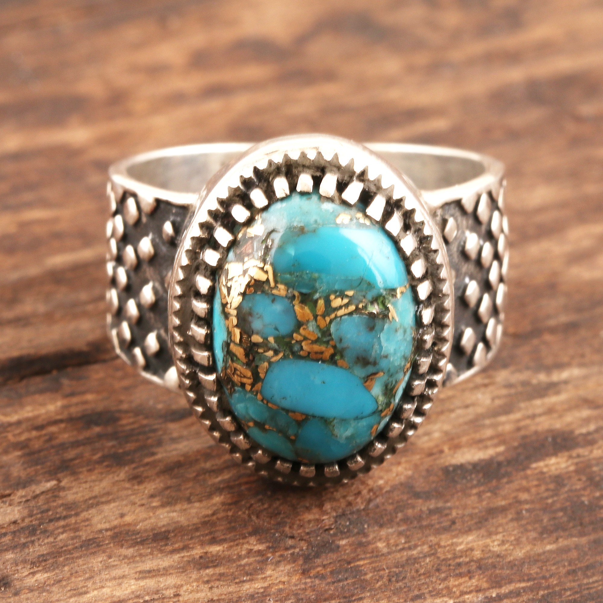 Designed by India's Tishita Jain, the allure of turquoise blue with golden veins is captivating in the design of this majestic men's ring. Within the sterling silver oval frame rests a smooth oval cabochon of composite turquoise set in a silver crown. The band of the ring features a diagonal pattern of silver squares, oxidized for contrast.
