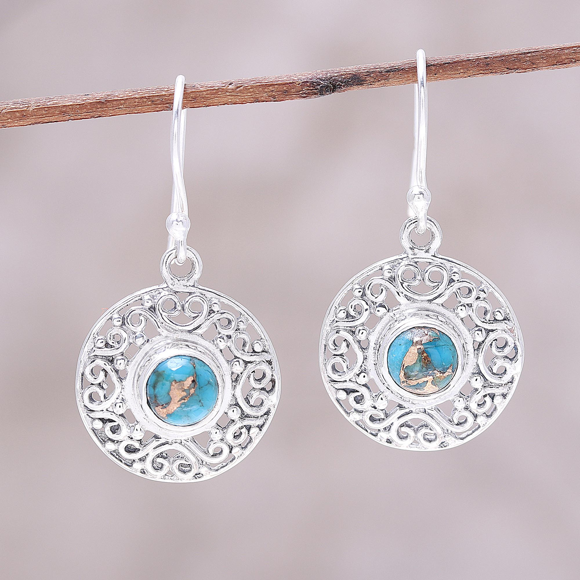 Shanker of India designs handcrafted dangle earrings reminiscent of a drop of the brilliant blue sea surrounded by the froth of a cresting wave. In these earrings, a round cabochon of composite turquoise is ringed with delicate sterling silver scrollwork.