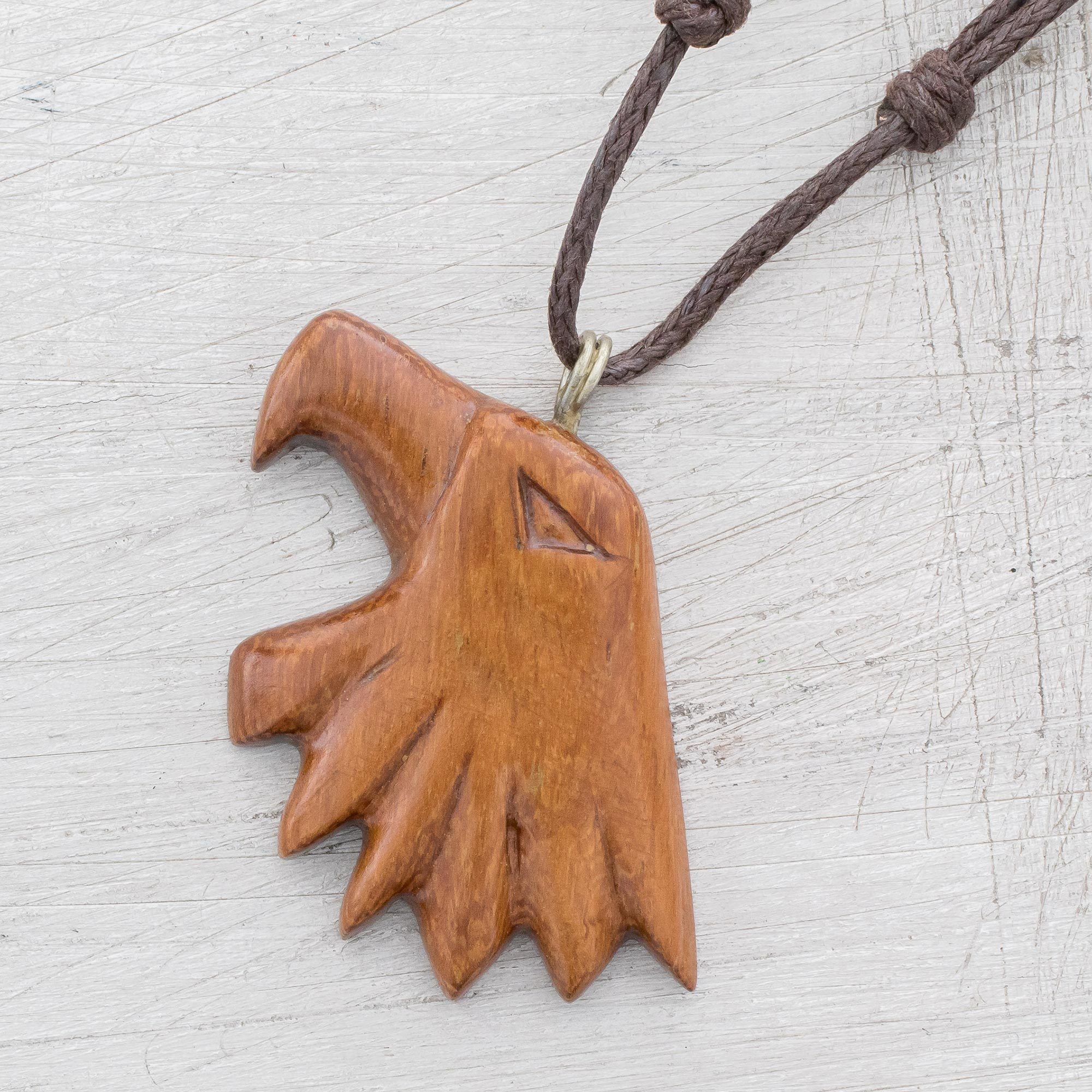 Working with beautiful natural conacaste wood, Costa Rican artisan Milagro Cascante hand-carves the bold profile of an eagle. This striking pendant necklace circles the neck with an adjustable length of cotton cord.