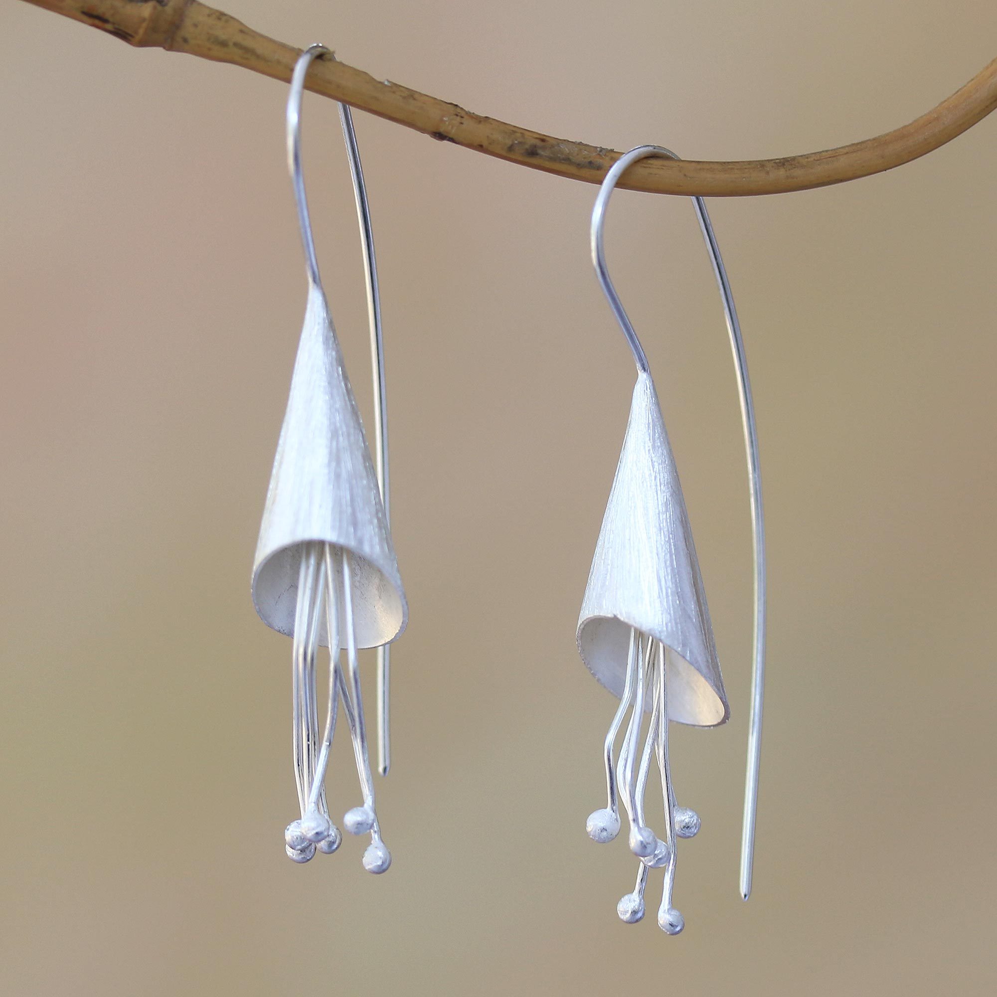 Handcrafted in cone shapes, two lovely sterling silver flowers fall below the ears in this pair of drop earrings from Bali. Desi Antari designs the earrings, which are accentuated by a combination of finishes.