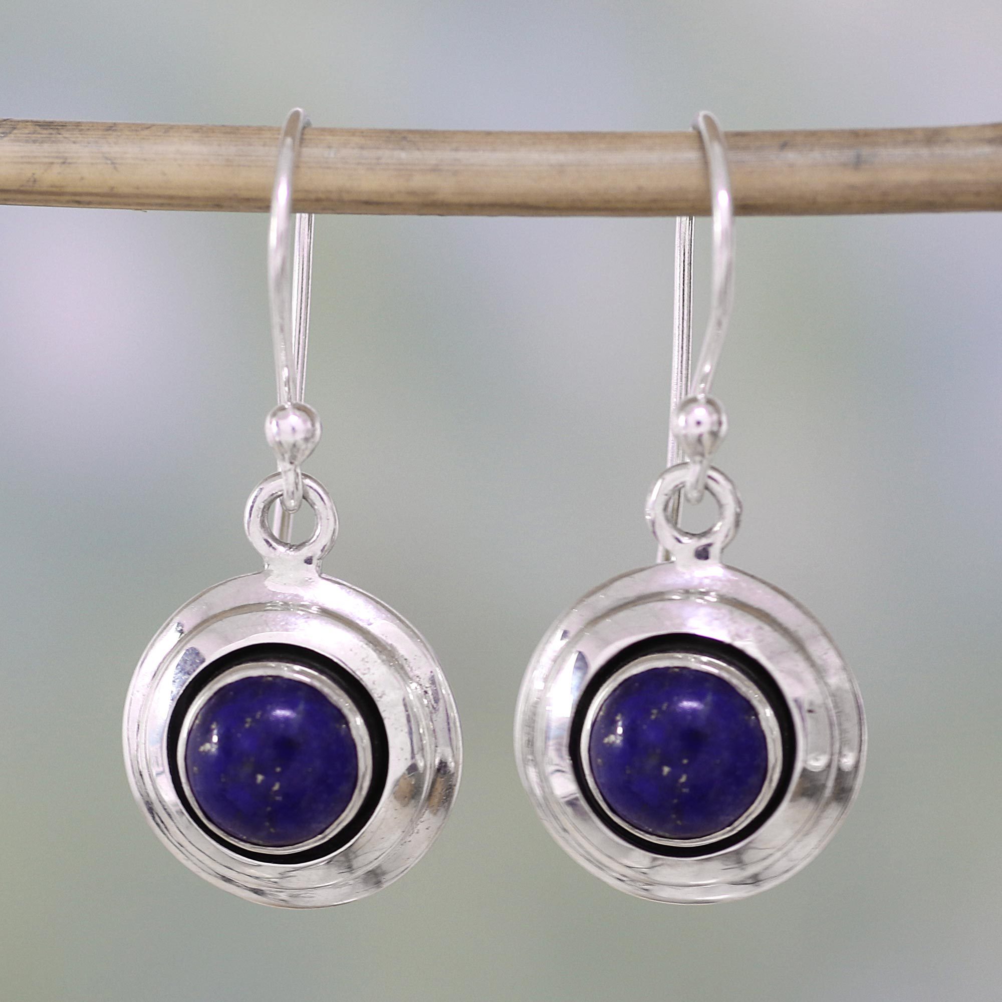 Presented by Shanker, this pair of Indian dangle earrings is handcrafted of fine sterling silver by local artisans. Dangling on hooks, shining discs host round stones of lapis lazuli that possess the dark blue hues of midnight.