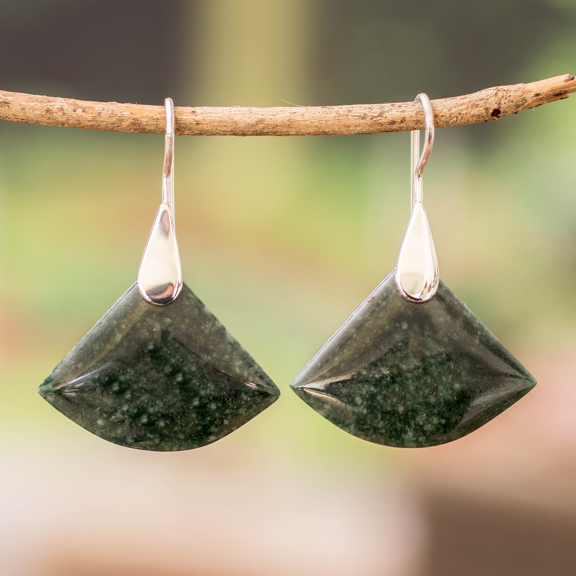 Treasured since ancient times, Guatemalan jade brings its rich green mystique to a a chic, contemporary design. Ruben and Gilda Perez work in polished sterling silver to craft dangle earrings that showcase a fan-shaped gem.