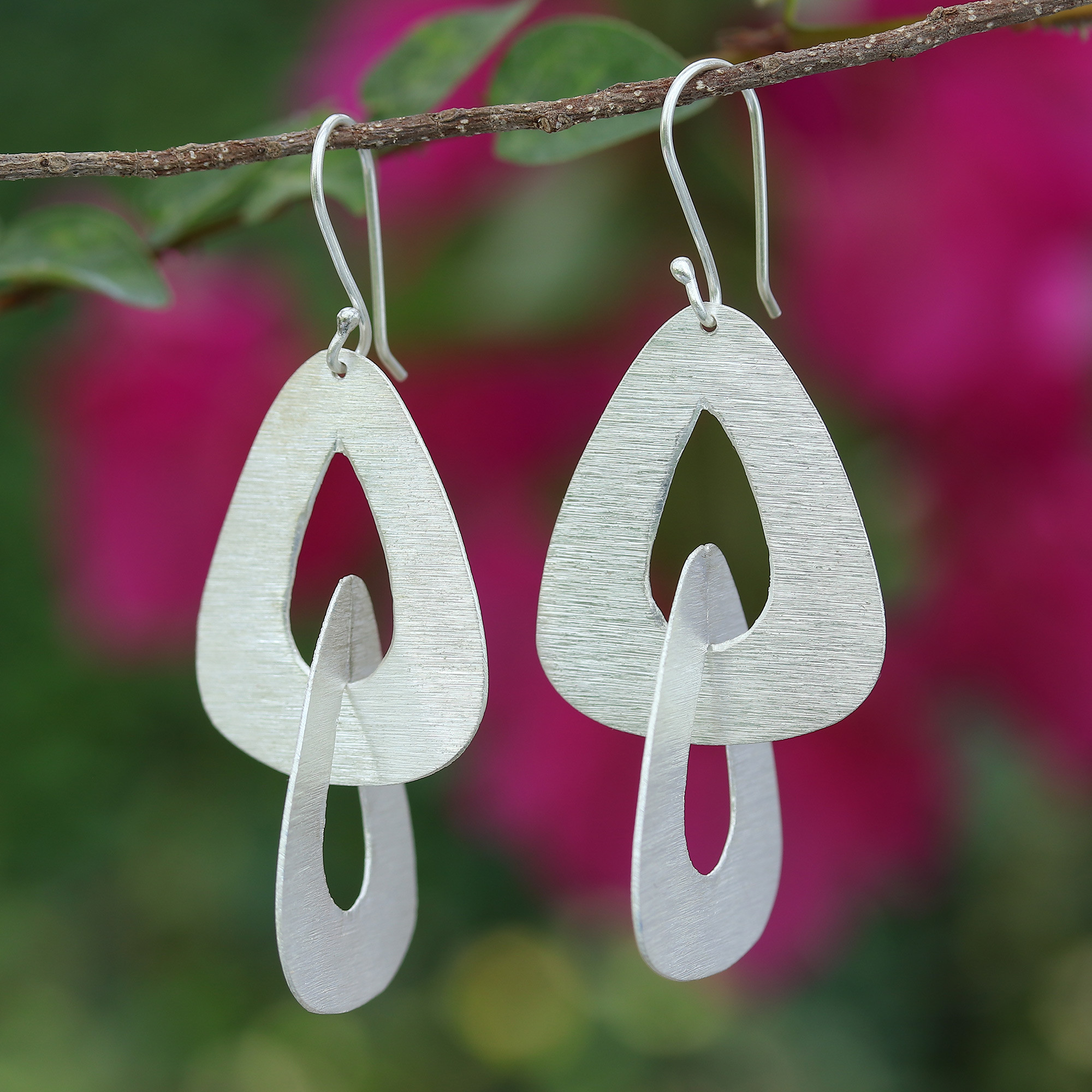 Interconnected shapes, textured details and sleek lines make these sterling silver dangle earrings a unique addition to any collection. Their thoughtful design with a brushed-satin finish catches the light with every movement, adding a touch of intrigue to any look. Presented by Thailand's Pakaon Sojintarit, they're the kind of earrings you'll reach for again and again, accessories that effortlessly adapt to your style no matter the occasion.