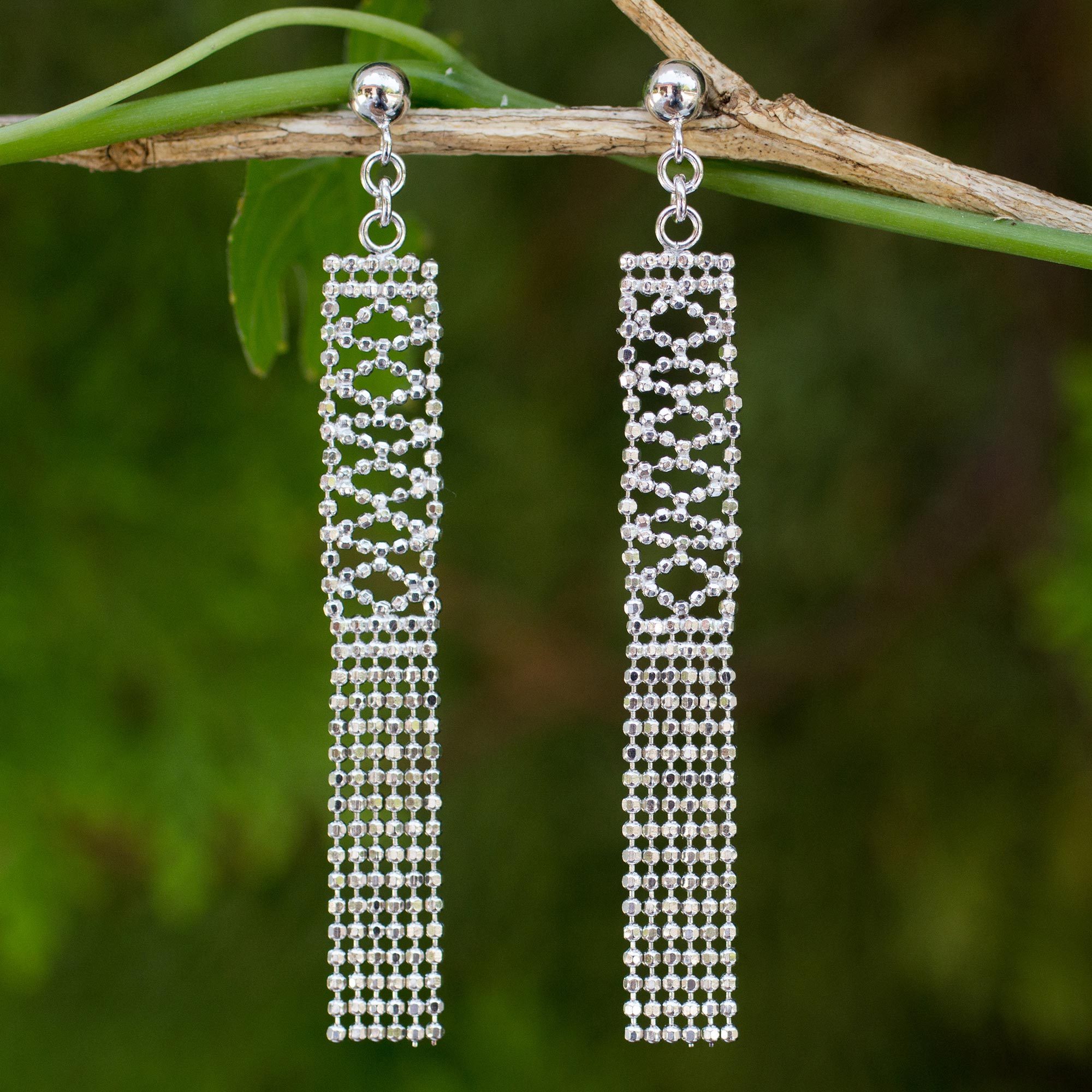 Thai artisan Angels gets creative with sterling silver ball chain, weaving it into diamond patterns for a fun pair of earrings. Ball chain fringe sways freely below to catch the light.