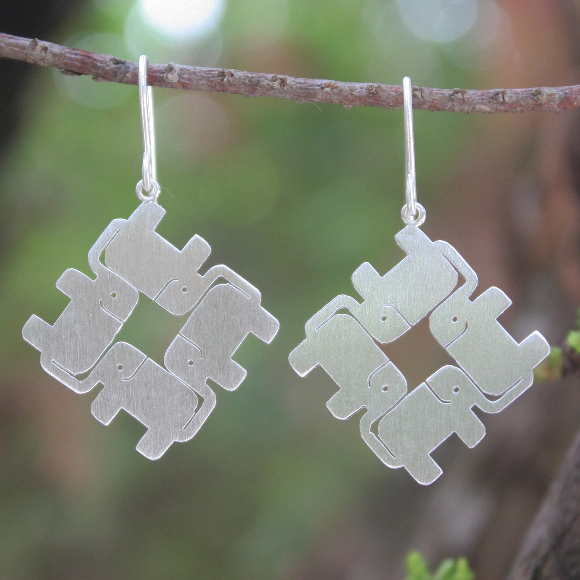 In this fresh and contemporary design by Jantana of Thailand, the artist references the traditional belief in a cosmic elephant with a modernist design of four elephants forming a square. .925 sterling silver with a stainless matte finish, these earrings dangle from silver hooks. Unique among earrings, these cosmic elephants will keep a weathered eye out for trouble while bringing good luck to the wearer.
