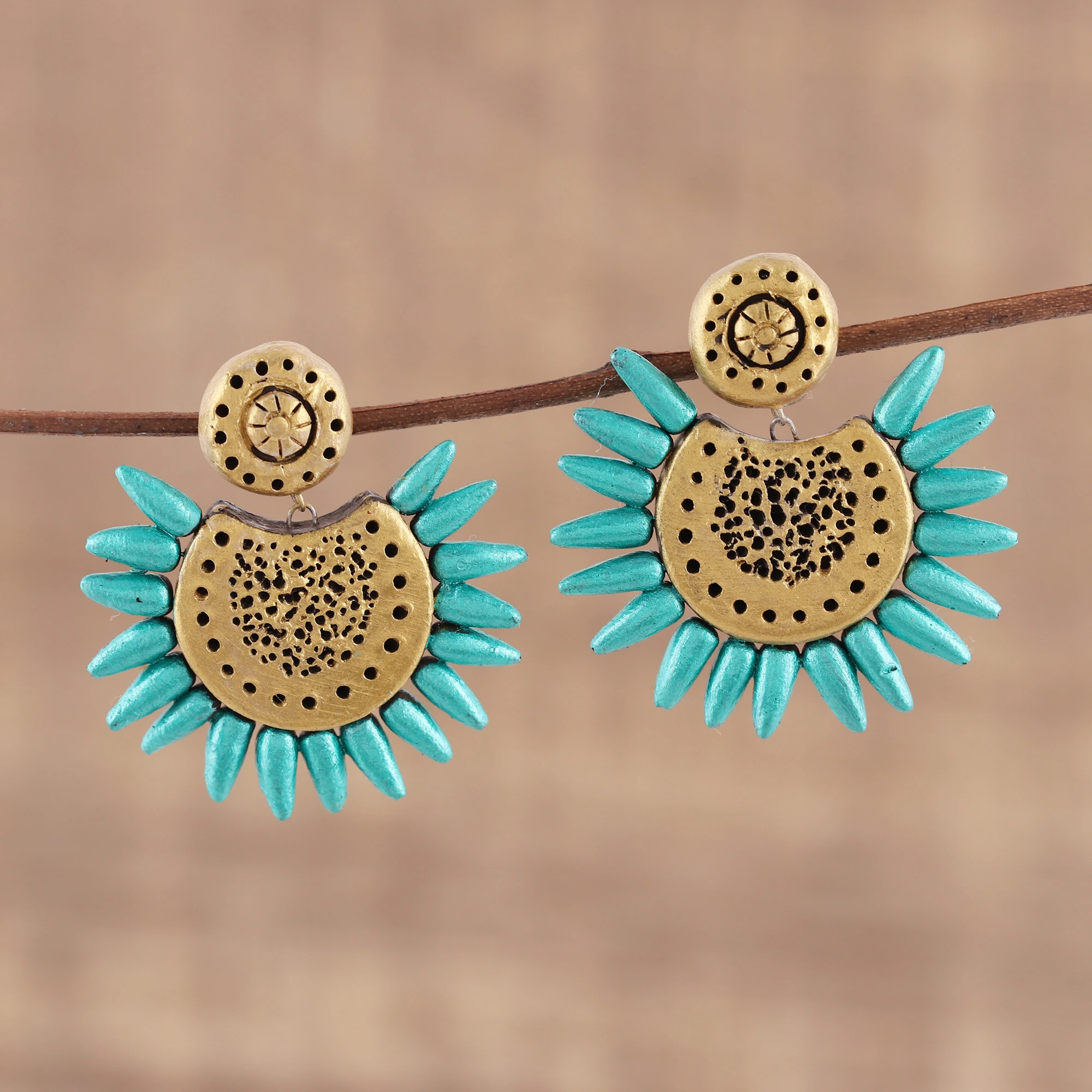 Two golden semicircles are surrounded by beautiful green coronas, featured in this pair of ceramic dangle earrings. India's Ritu Thapar designs these lovely earrings, dangling from sterling silver posts.