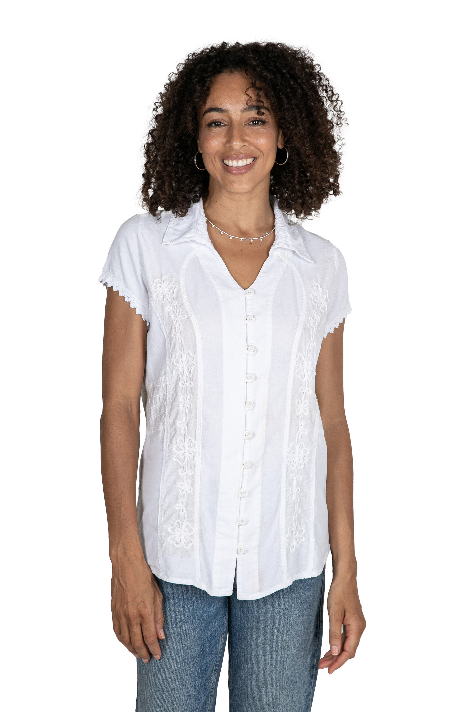 Cotton Blouse with Floral Embroidery in Bright White, 'Bright Summer'