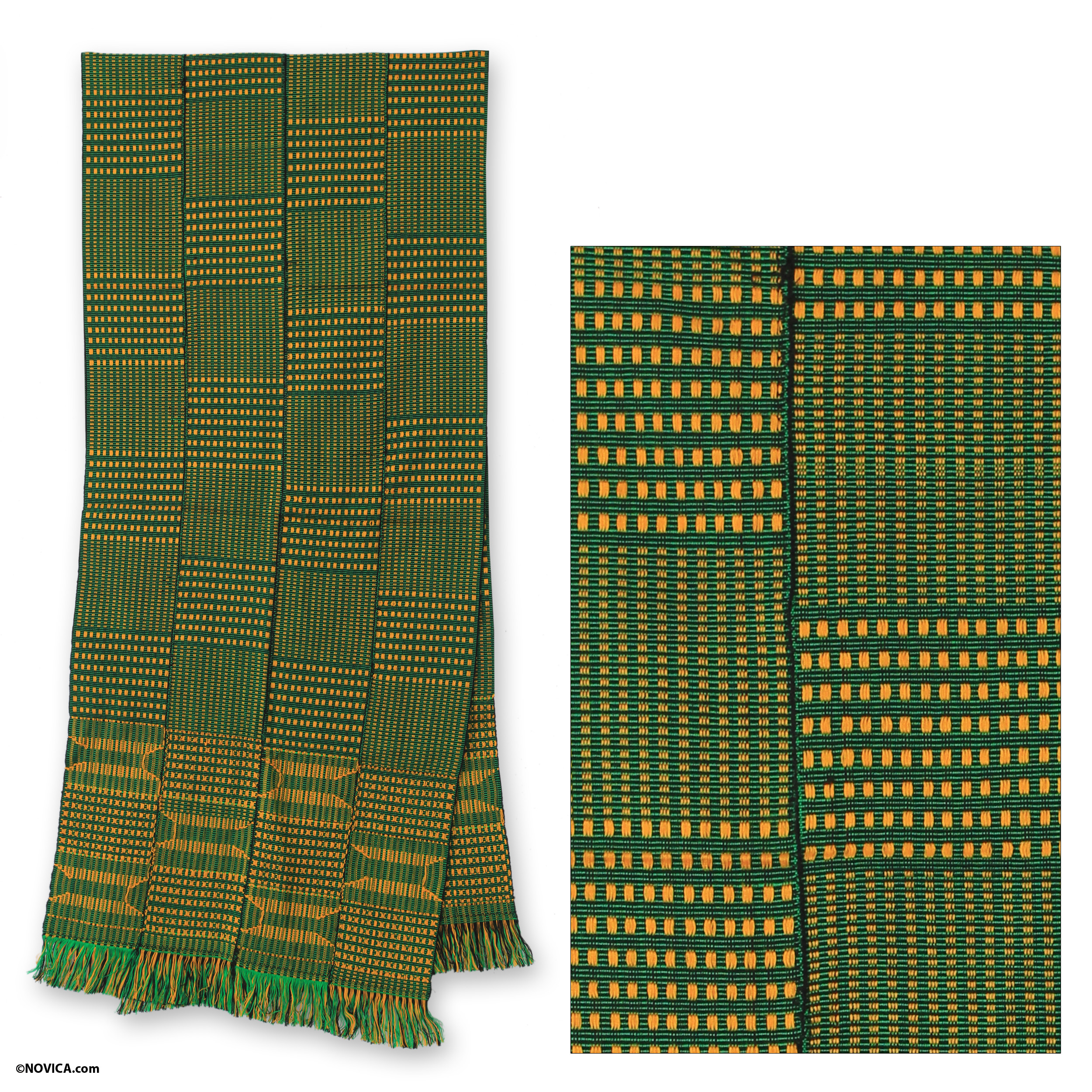 Shimmering strands of yellow rayon are skillfully worked across green and black threads in this superlative kente cloth scarf. An extremely intricate double weave, its pattern is created primarily on the weft, or horizontal threads of the loom. Great care must be taken so that the blocks of color have same size and match one another when the woven strips are joined. A special stick is used to measure the cloth on the loom so Gobah Tengey-Seddoh names this design Atikpui (measure).