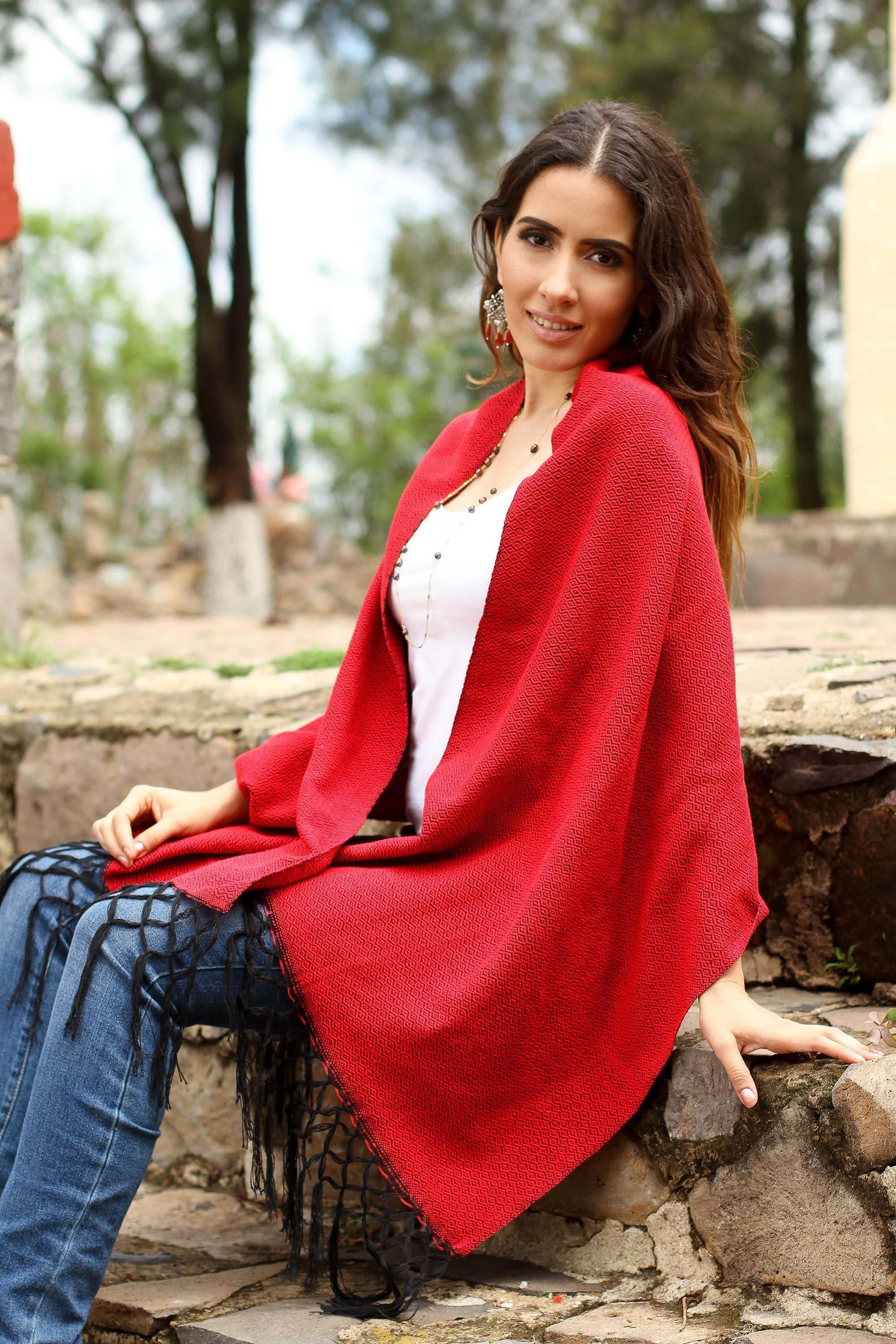 Woven by hand on a traditional loom, this colorful rebozo shawl reveals ancestral Zapotec textile arts. Angela Quiñones works in black cotton, creating concentric diamond motifs on pink. With its long macramé fringe, the wrap is lightweight and cozy.
