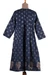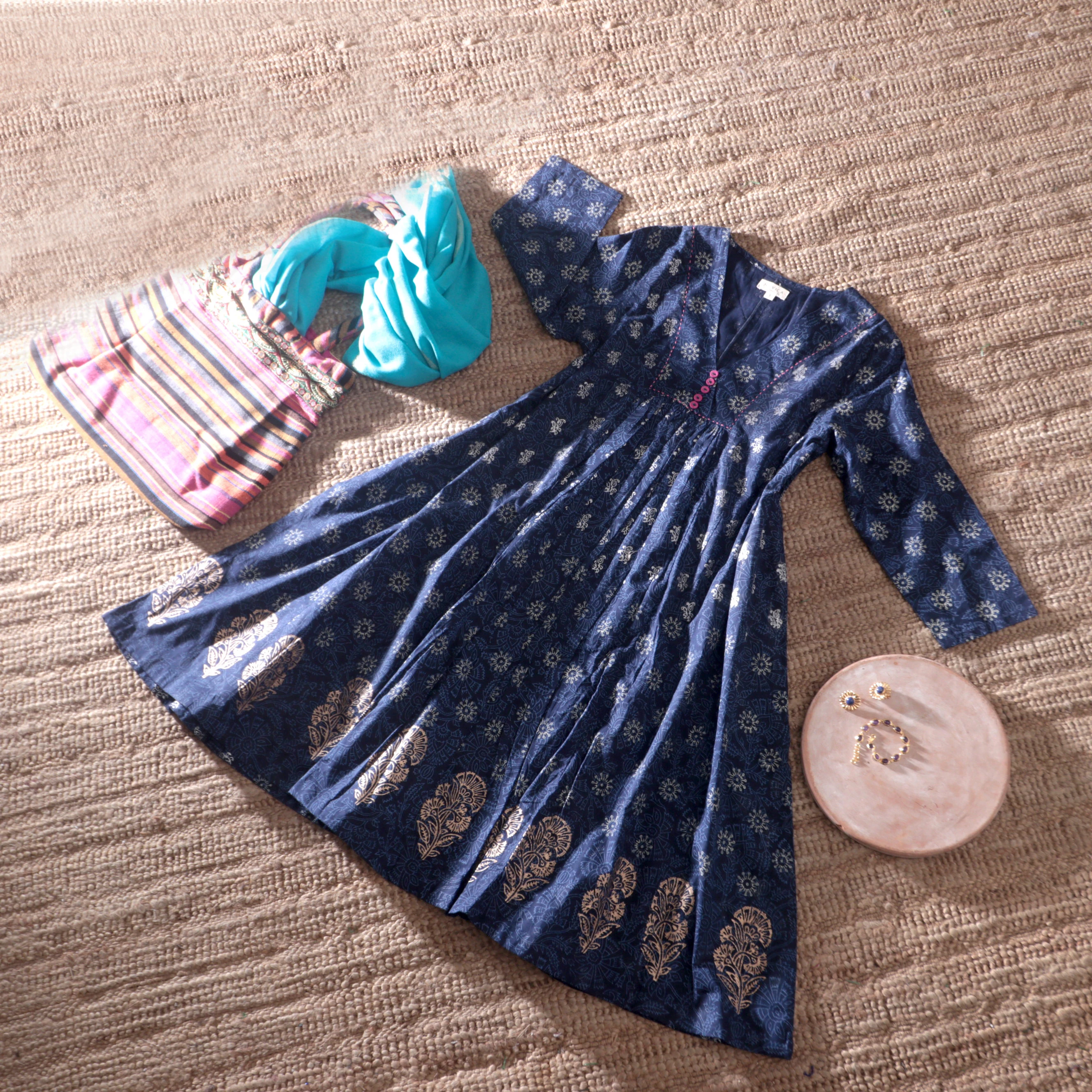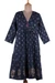 A graceful blend of comfort and tradition, this indigo cotton tunic dress features hand block-printed floral and leaf motifs and a softly gathered waistline for a flattering drape. The V-neckline is accented with contrast stitching and bright buttons, while the golden border print along the hem adds a refined finishing touch. Designed by India's Isha Jain, it is perfect for casual outings or relaxed evenings.