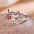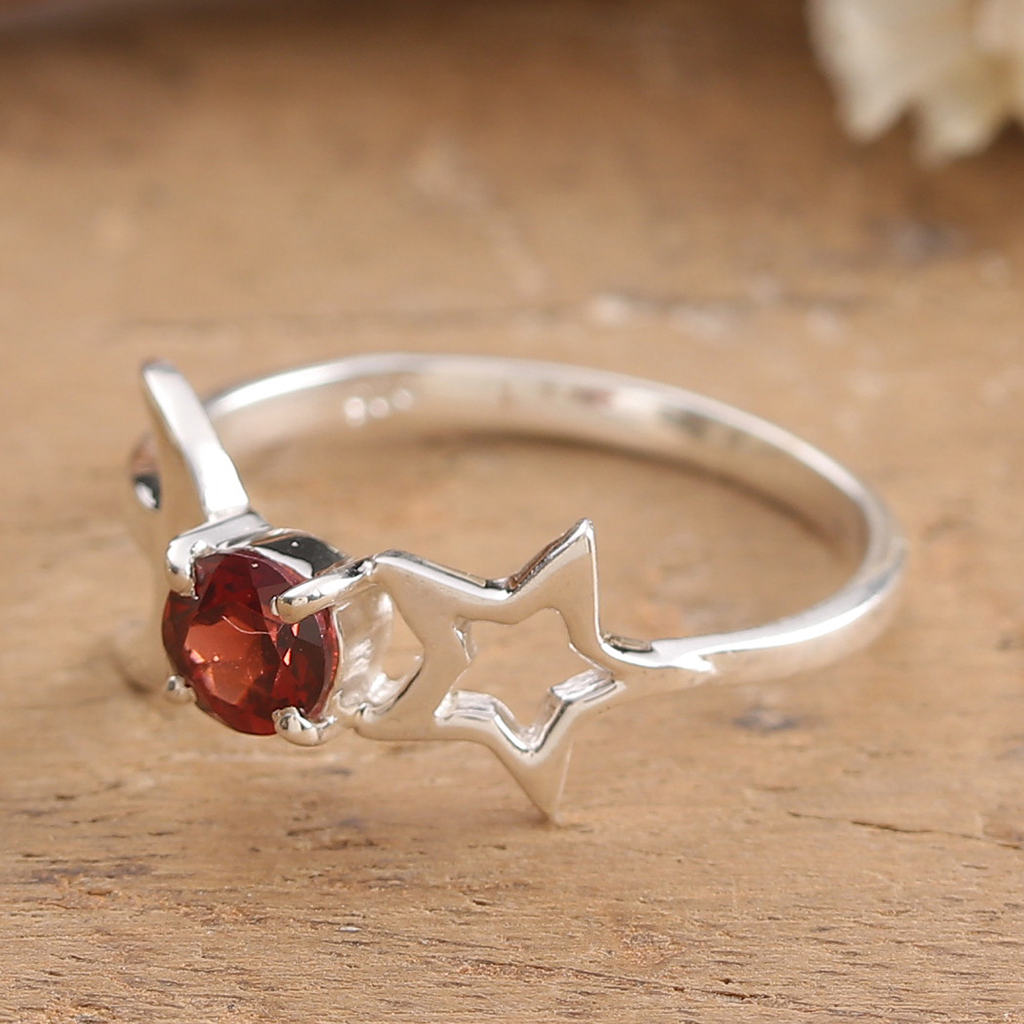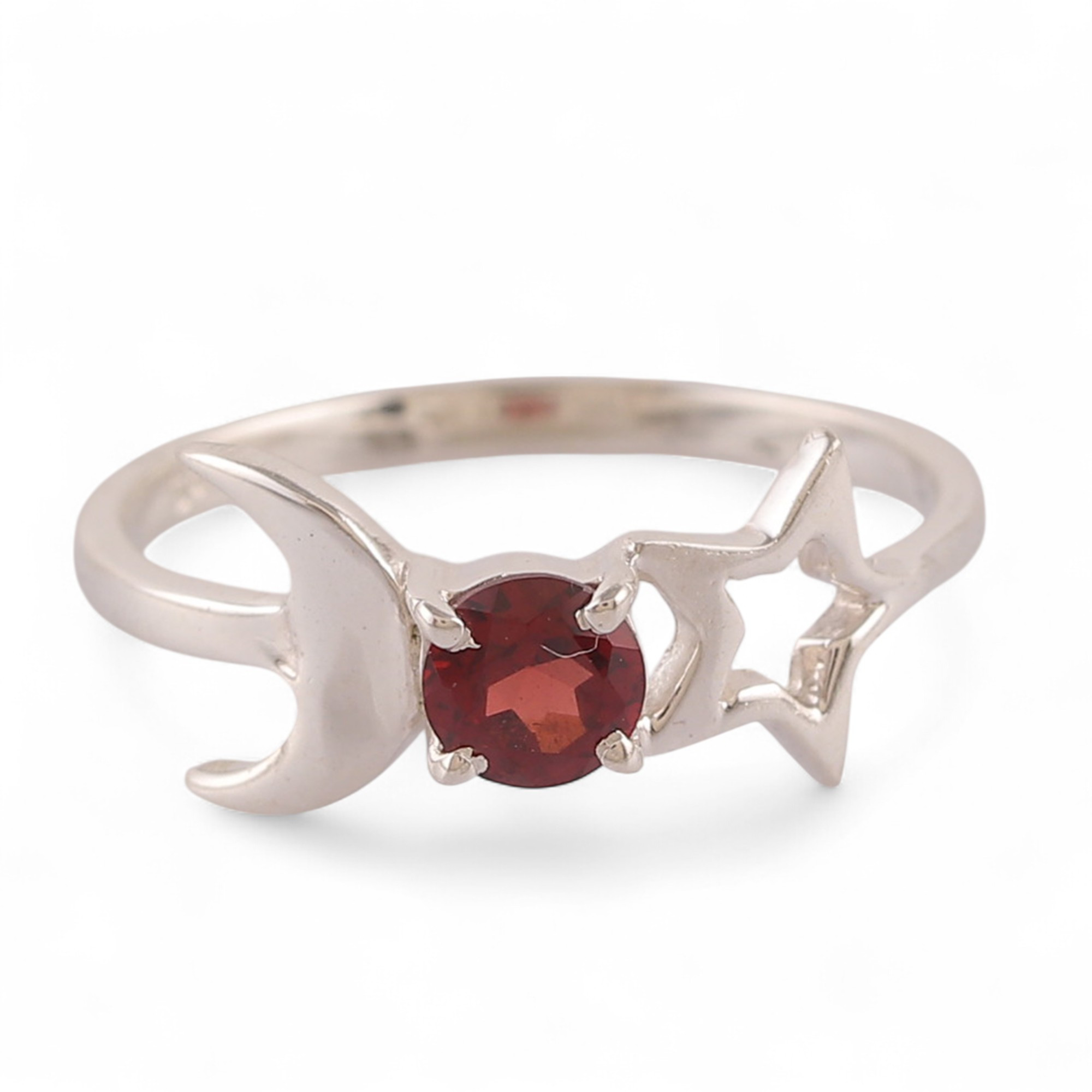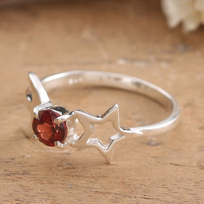 Crescent Moon Star-Themed Openwork Garnet Silver Band Ring, 'Cosmic Love'
