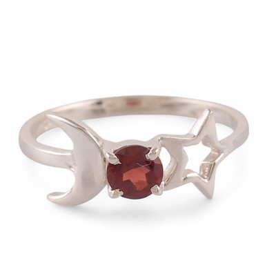 A brilliant garnet stone bursts forth like fireworks in this sterling silver band ring of celestial inspiration. Presented by India's Chintan, this eye-catching design showcases a crescent moon and hollow star motifs flanking the crimson gem, adding instant pizzazz to your fashion repertoire.