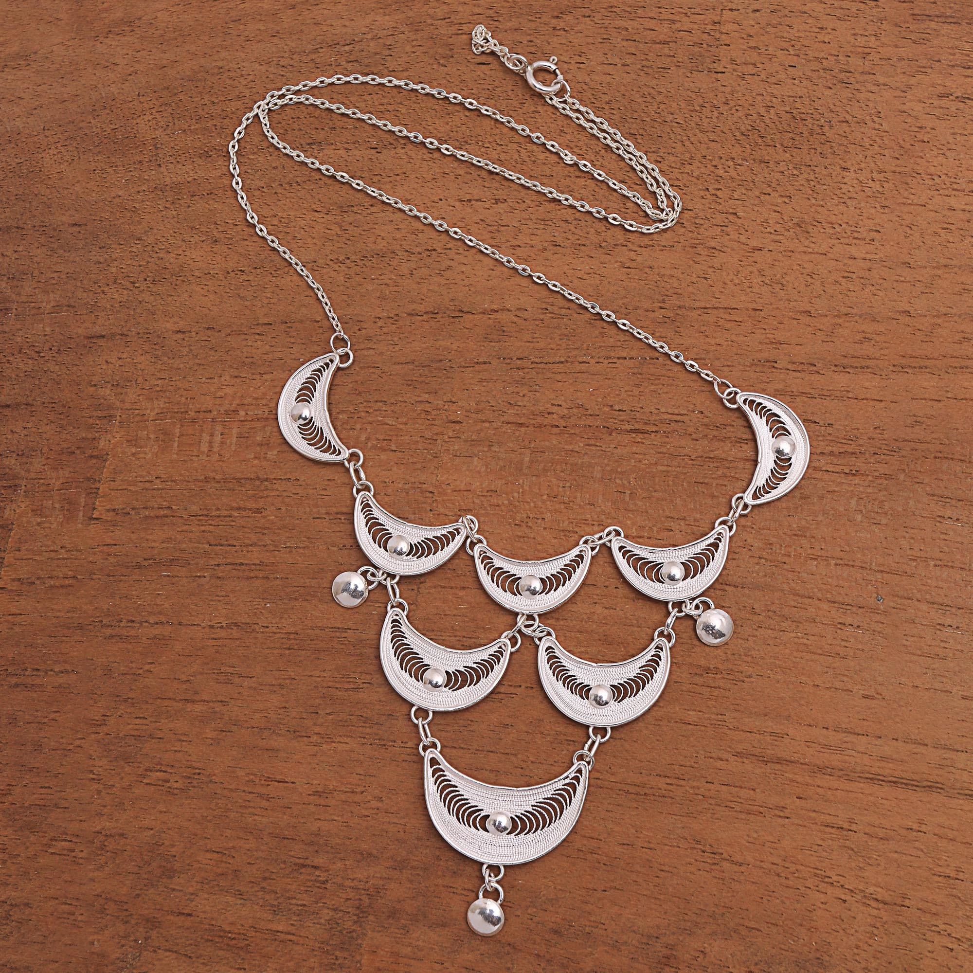 Meaning "crescent" in the Indonesian language, this necklace is named Sabit. Javanese artisan Selly Sagita designs this necklace, which features a pendant of handcrafted sterling silver filigree crescents that are all linked together. Sterling baubles dangle from the elaborate pendant.