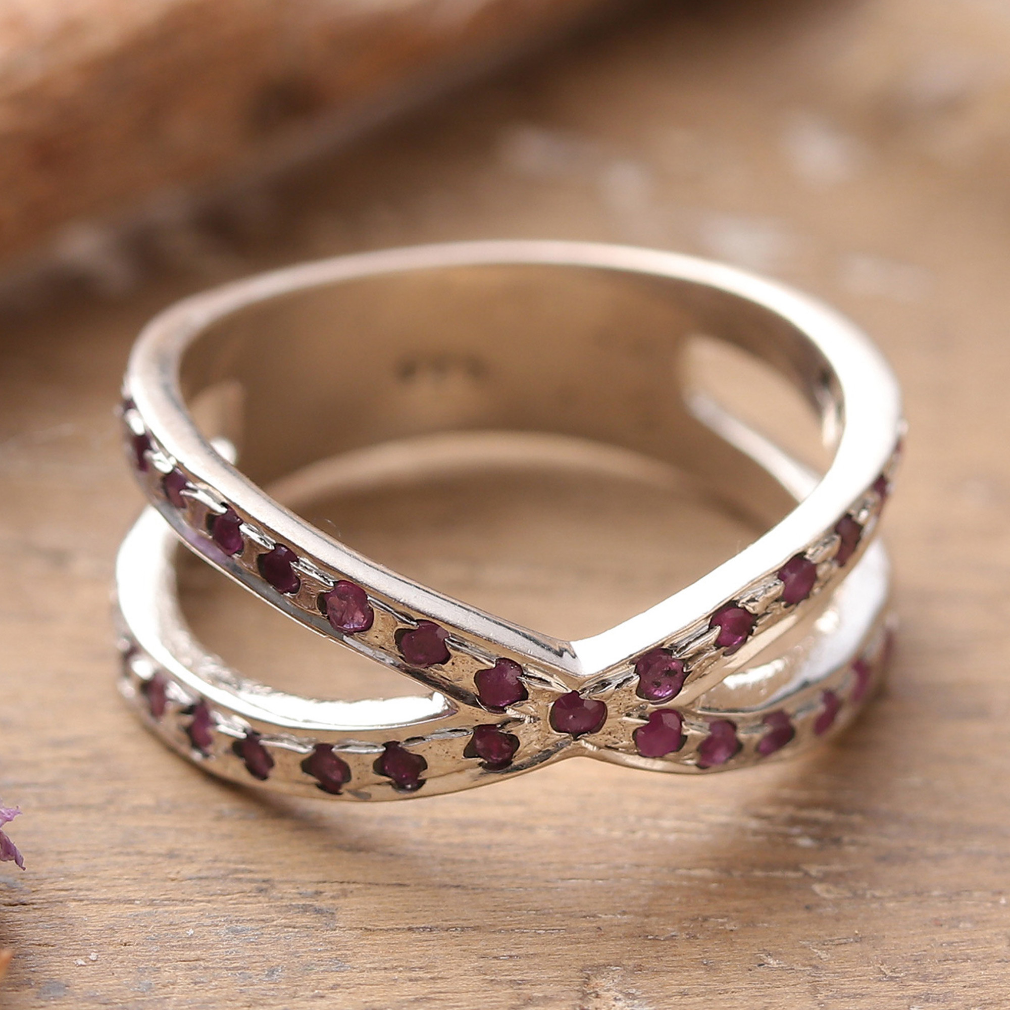Crisscross Silver Band Ring with Pavé-Set Ruby Gemstones, 'Faithful Constellations'